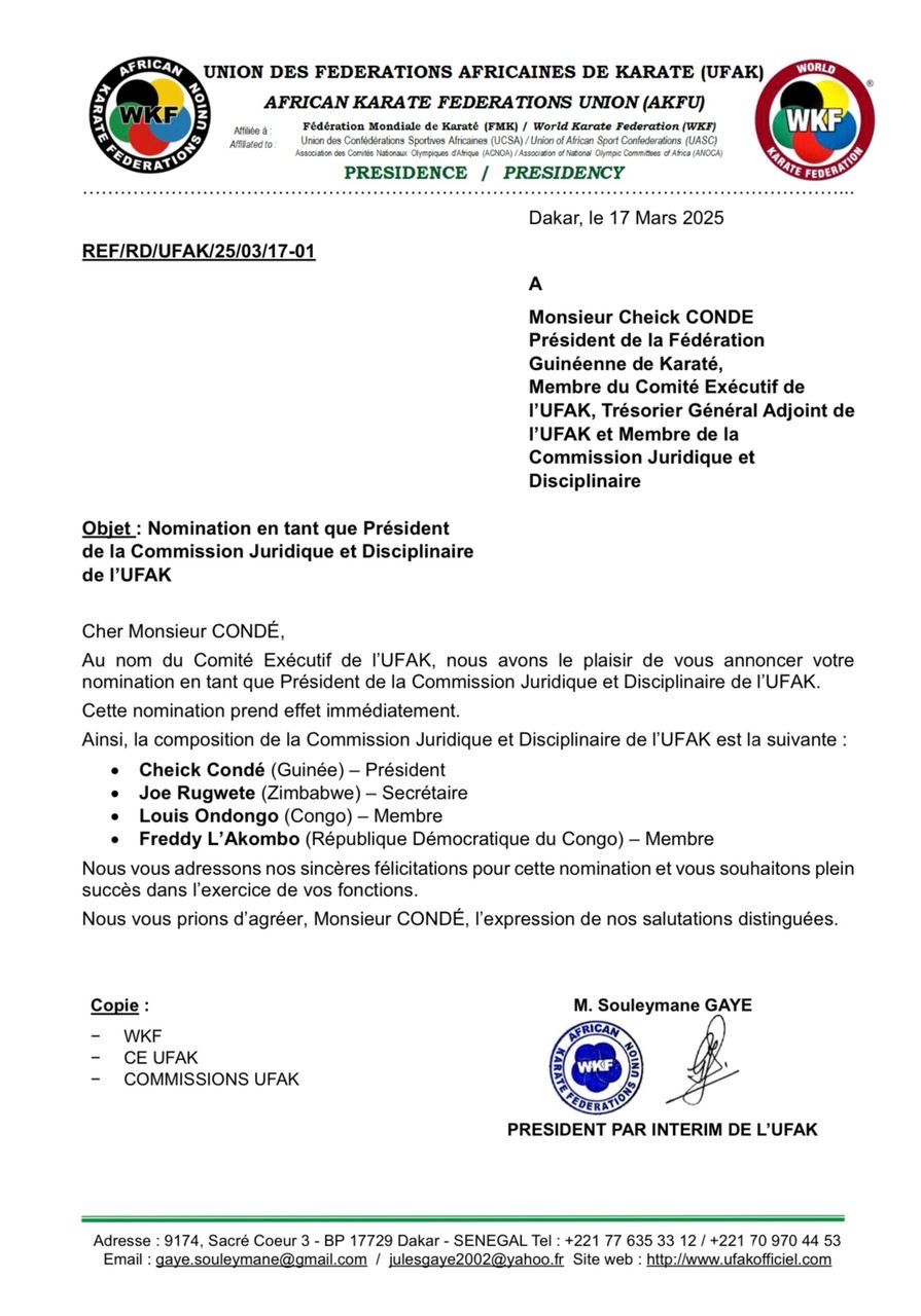 Le président de la Fédération guinéenne de karaté, Maitre Cheikh Condé également trésorier général du Comité National Olympique et Sportif Guinéen a été nommé président de cette commission chargée de veiller au respect des règlements et de sanctionner les violations des règles au sein de l’Union des fédérations africaines de Karaté (UFAK).