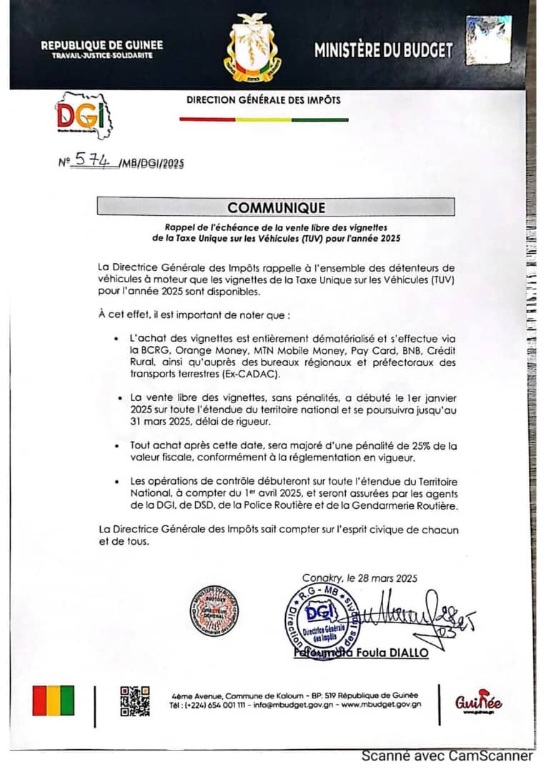À 3 jours du terme de la vente libre des vignettes de la taxe unique sur les véhicules, la Direction générale des impôts a annoncé dans un communiqué en date du vendredi 28 mars 2025, que les opérations de contrôle débuteront sur toute l’étendue du territoire national à partir du 1er avril 2025.