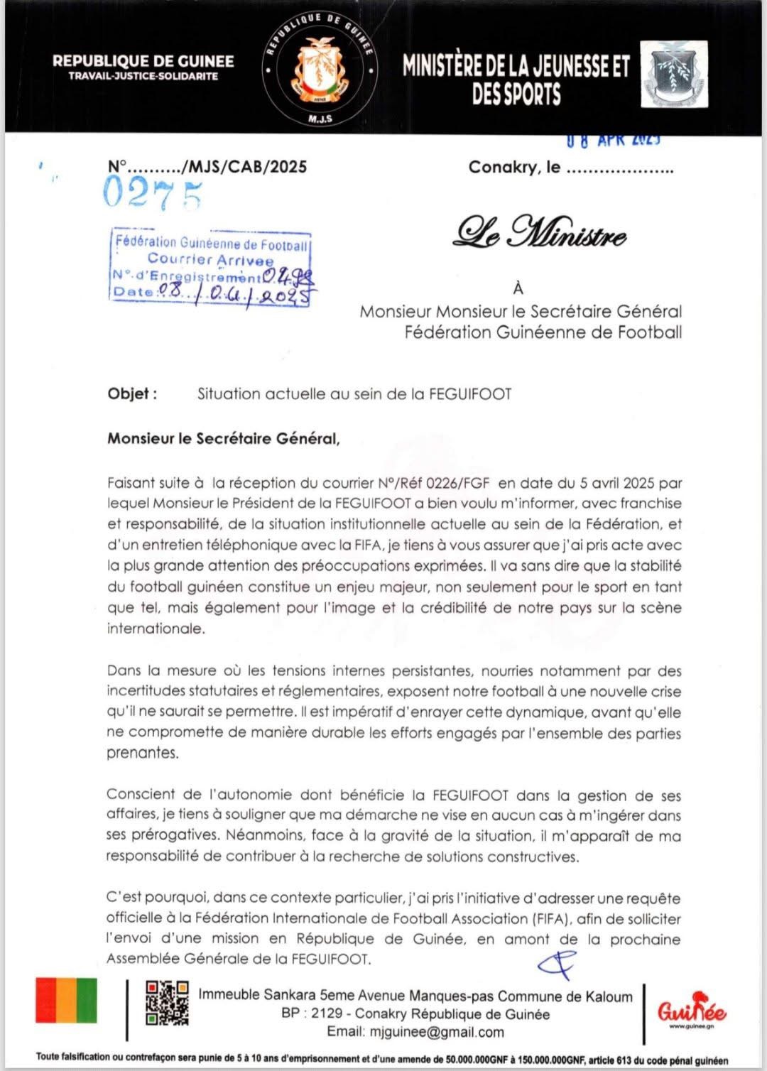 Inquiet de la nouvelle crise qui secoue le comité exécutif de la Fédération guinéenne de football – FGF, Keamou Bogola Haba, Ministre de la jeunesse et des sports, a adressé un courrier au secrétaire général de l’instance dirigeante du sport roi en Guinée.