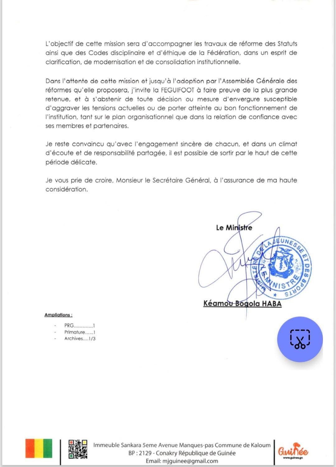 Dans ce document, Keamou Bogola Haba, précise que ça démarche ne vise pas à s’ingérer dans la gestion de la Féguifoot mais plutôt en tant que Ministre en Charge de la gestion du sport en Guinée, de trouver une issue favorable à cette mésentente.