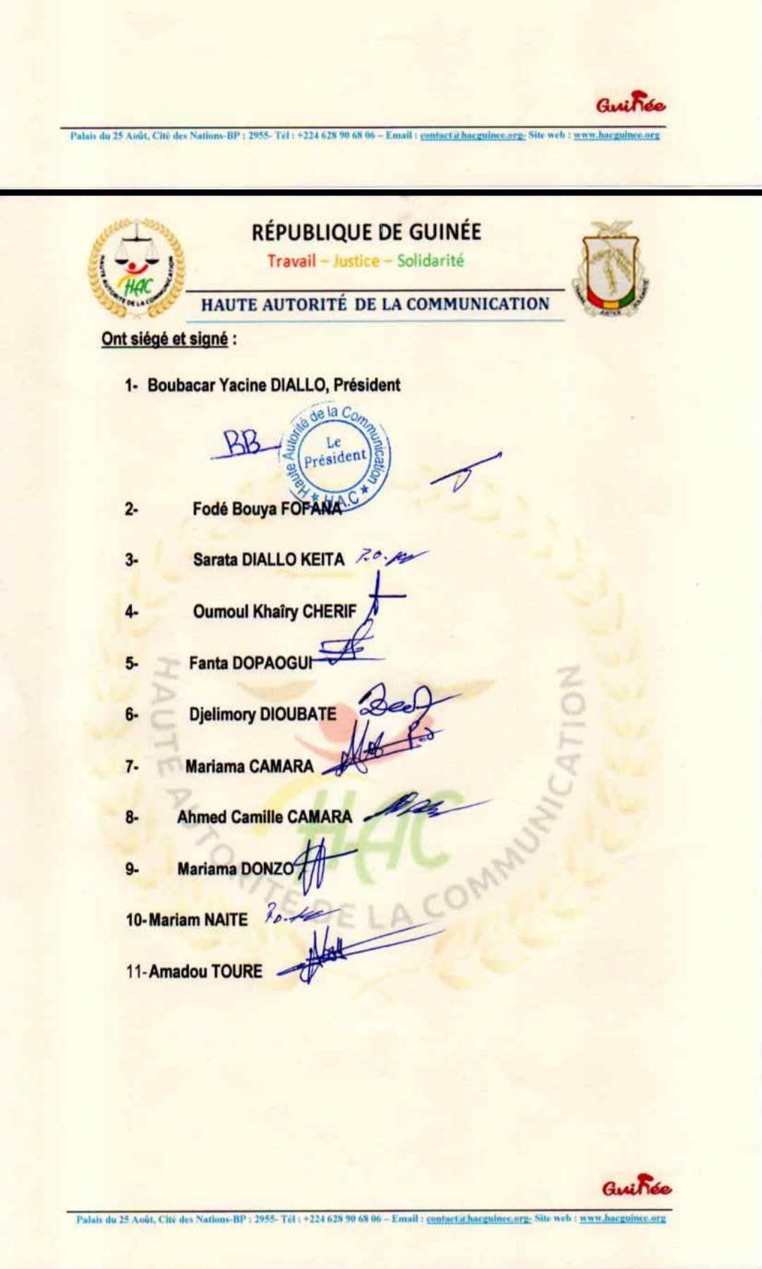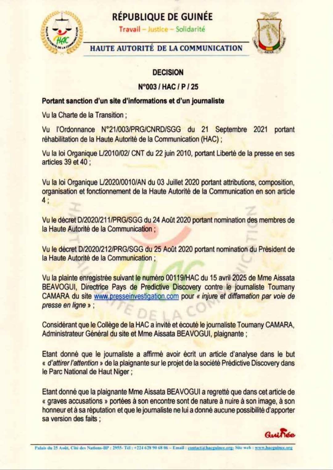 Cette sanction fait suite à un article jugé diffamatoire envers Mme Aissata Beavogui, accusée sans preuve par le média et le journaliste d’être responsable d’échecs passés et futurs dans des projets miniers.