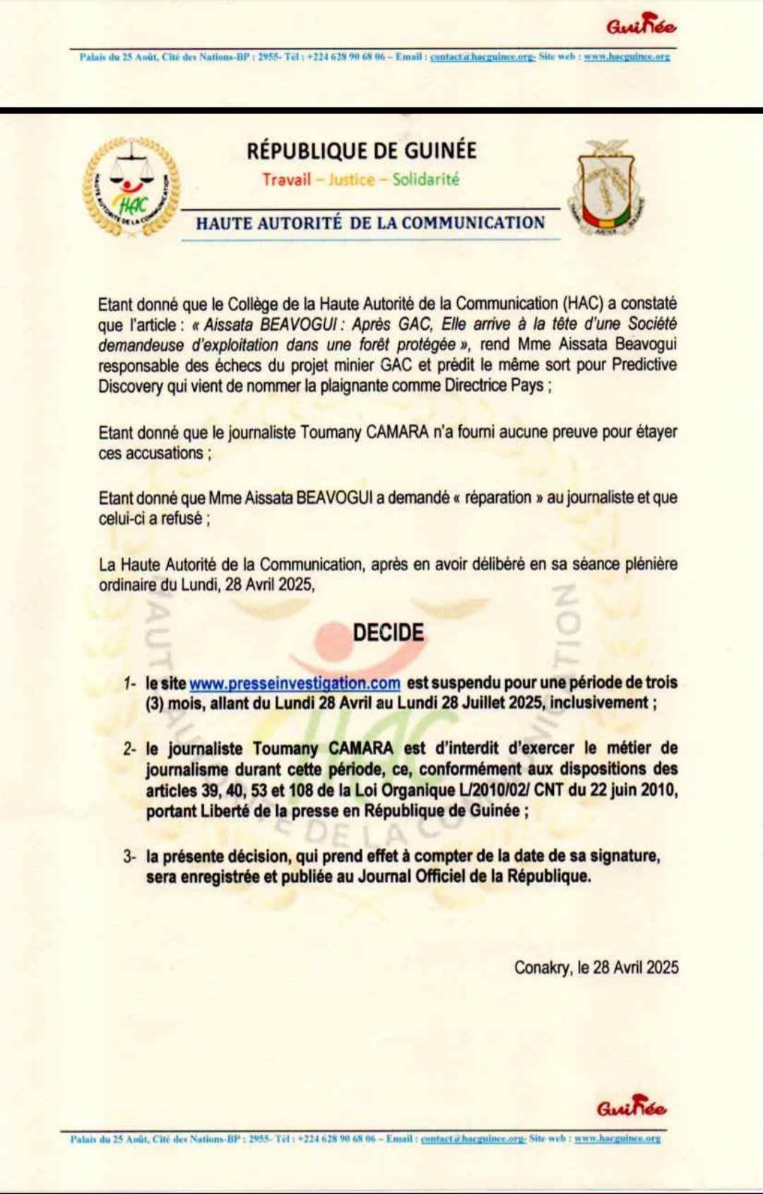 La Haute Autorité de la Communication (HAC) a suspendu le site d’information Presseinvestigation pour trois mois (28 avril au 28 juillet 2025) et interdit au journaliste Toumany Camara d’exercer durant cette période.