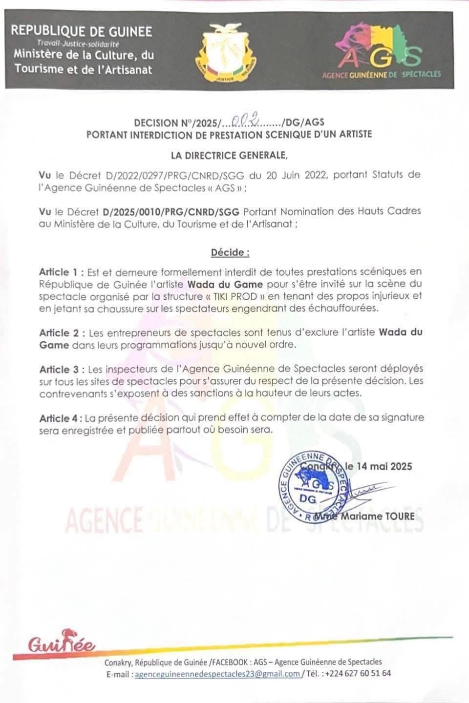C’est pourquoi, l’Agence guinéenne de spectacles instruit à toutes structures événementielles du secteur culturel guinéen à exclure l’artiste Wada du Game de leurs programmes jusqu’à nouvel ordre.