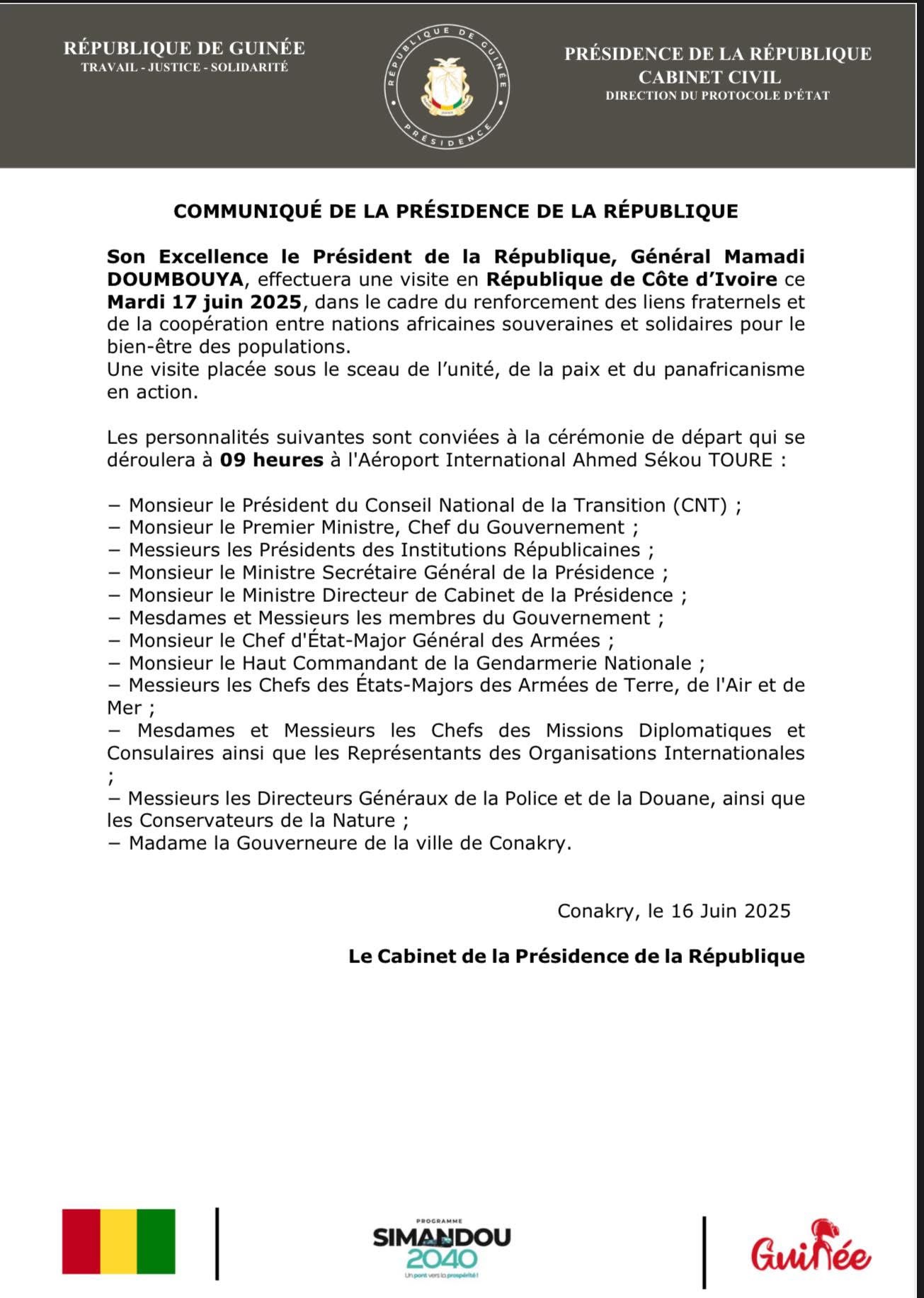 L’annonce a été faite ce lundi après-midi, par le cabinet de la présidence de République qui indique que ce déplacement du chef de l’État guinéen pour la Côte D’Ivoire s’inscrit dans le cadre du renforcement des liens fraternels et de la coopération entre nations africaines souveraines et solidaires pour le bien-être des populations.