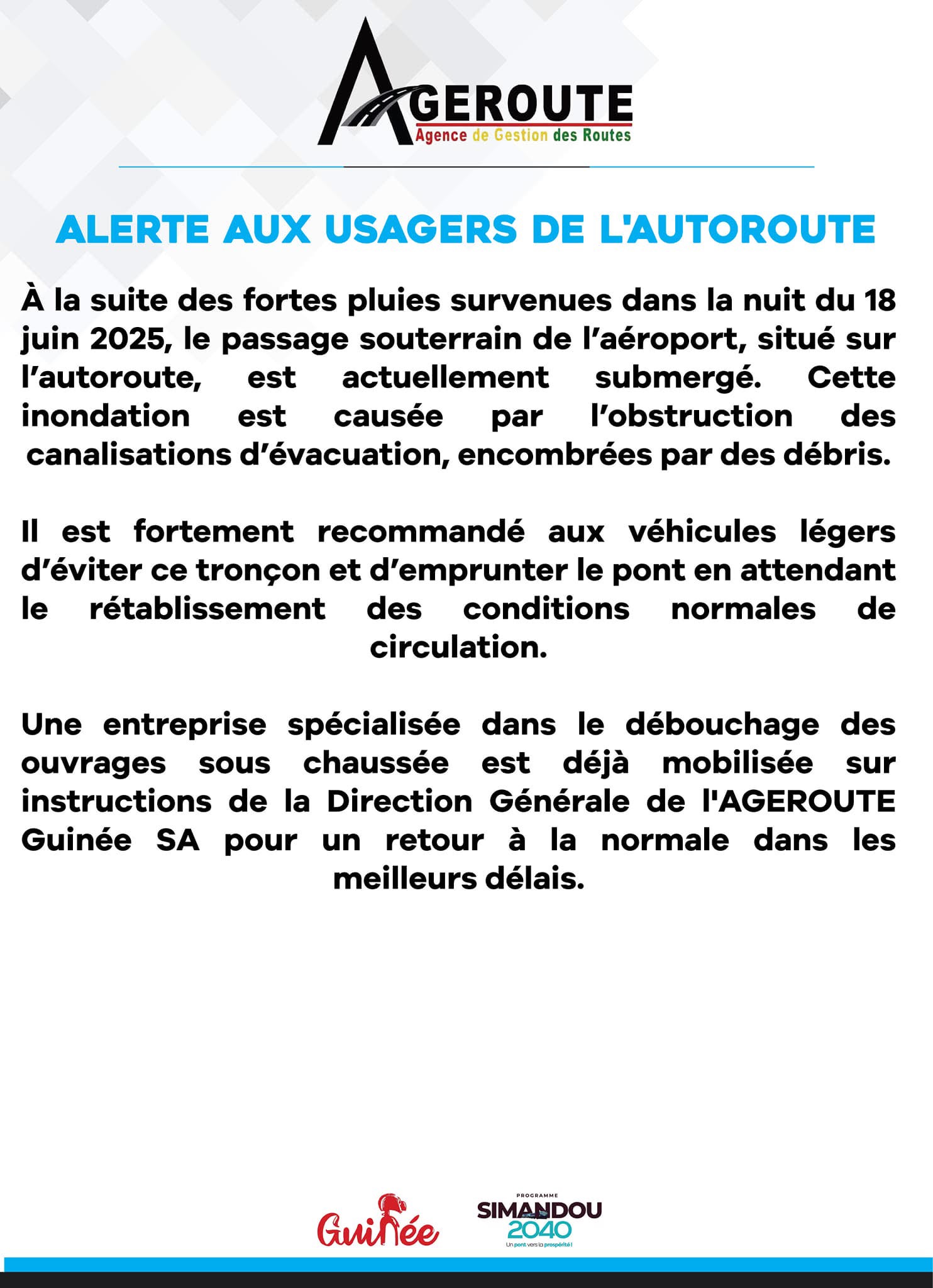 Pour faire face à l’inondation du passage souterrain de la route de l’aéroport, qui constitue un frein pour l’usage de cette route, l’AGEROUTE, annonce, à travers un communiqué, avoir déployer sur les lieux, une équipe spécialisée pour déboucher les canalisations d’évacuation des eaux usées.