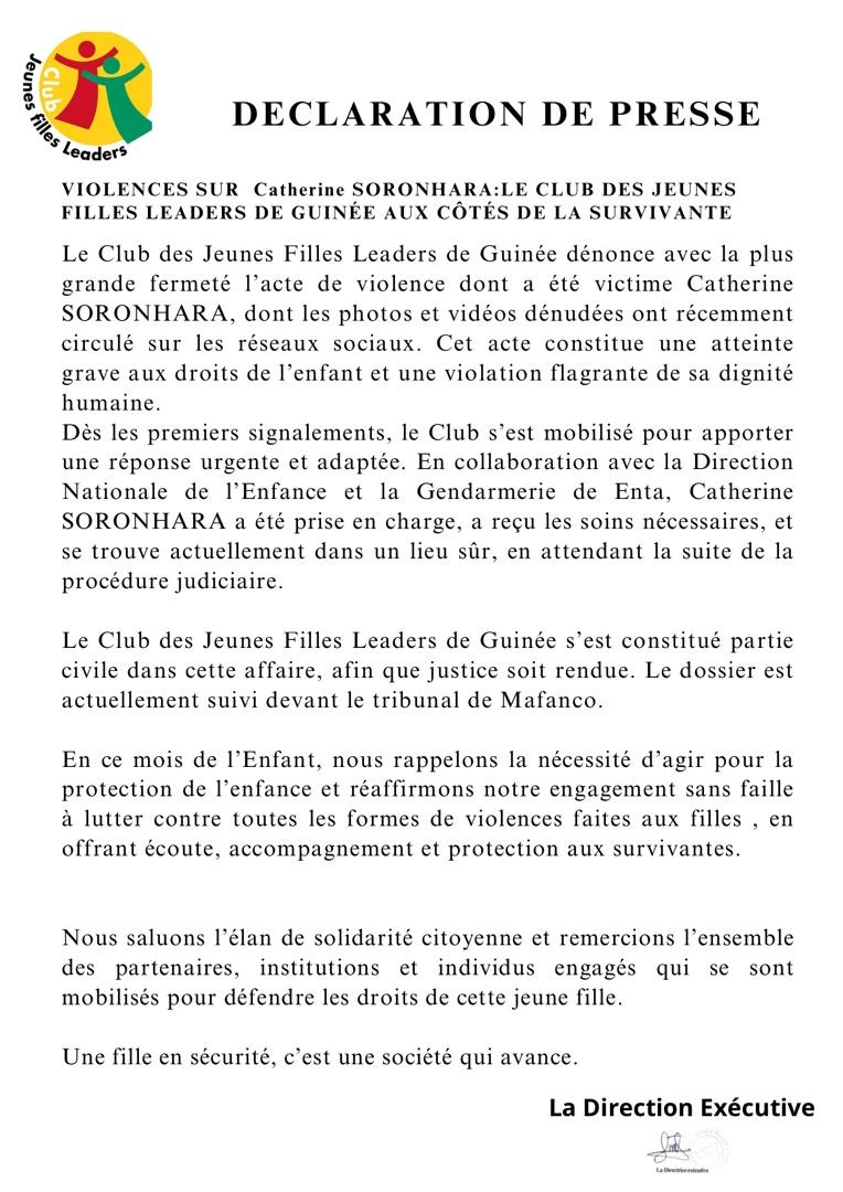 Face aux violences infligées à la jeune Catherine Soronhara, par sa « grande sœur » jeudi dernier, 19 juin à Entag, le Club des Jeunes Filles Leaders de Guinée, a, à travers communiqué, dénoncé cet acte inhumain dont a subi la jeune fille.