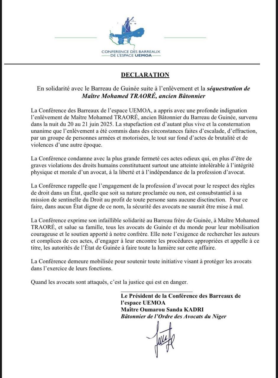 L’enlèvement et la séquestration dont a été victime Me Mohamed Traoré, ancien président de l’Ordre des Avocats de Guinée continue de susciter des réactions. Cette fois-ci, c’est la Conférence des Barreaux de l’espace UEMOA, qui a brisé le silence face à cette pratique d’une autre époque qu’elle n’a d’ailleurs pas manqué de condamner. La Conférence qui apporte son soutien à l’ex bâtonnier de Guinée ainsi que sa famille et ses proches a exprimé son indignation face à ces actes odieux. Elle exige également aux autorités guinéennes de traquer les complices et coupable de cette affaire.