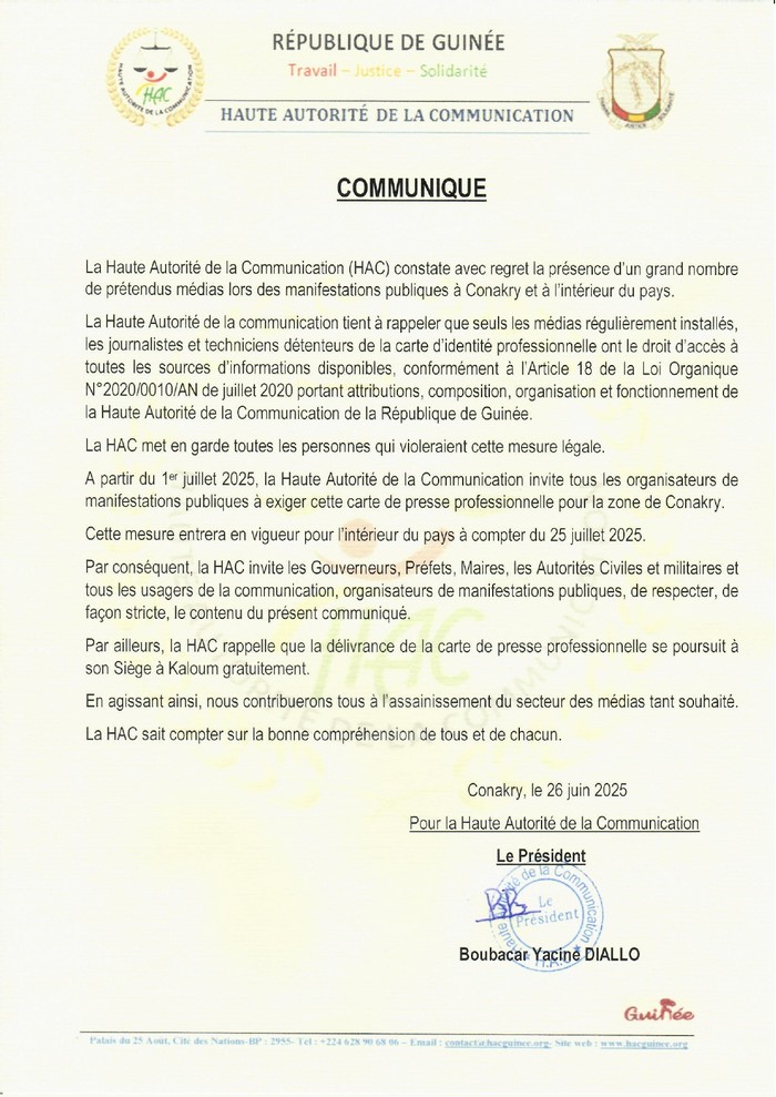 Dans un communiqué publié ce jeudi 26 juin 2025, la Haute Autorité de la Communication (HAC) exprime ses regrets après avoir constaté la présence importante de prétendus médias lors des manifestations publiques à Conakry et dans d’autres régions du pays.