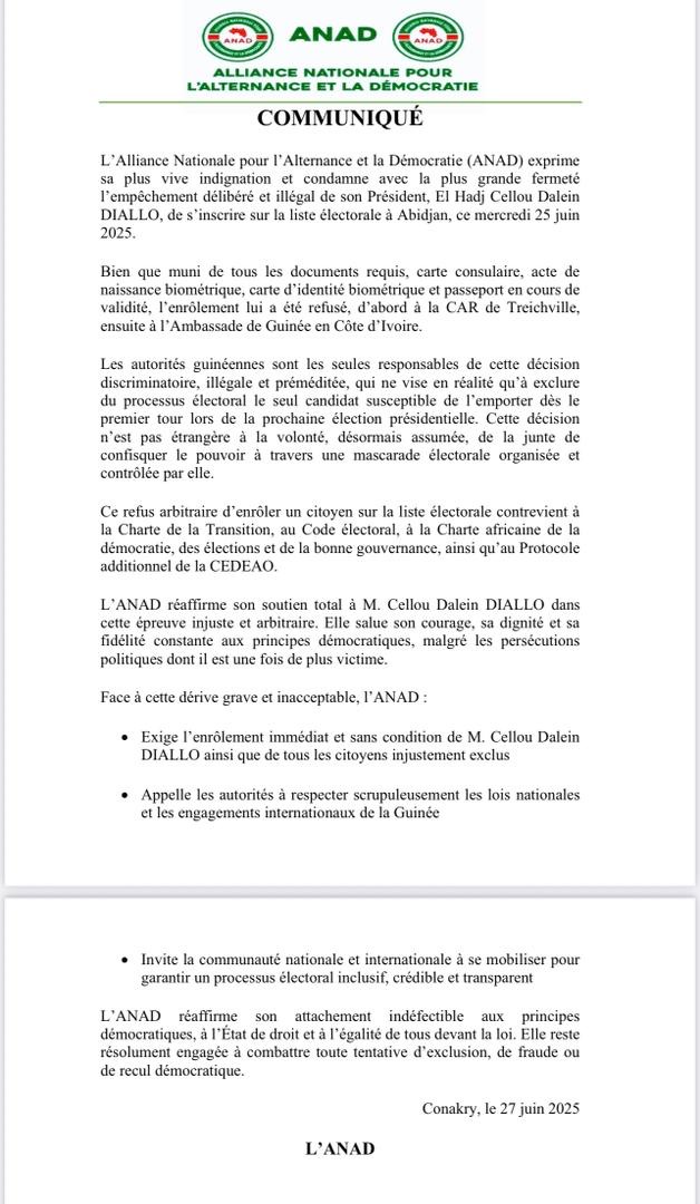 Dans un communiqué publié vendredi, 27 juin 2025, l’Alliance Nationale pour l’Alternance et la Démocratie (ANAD), qui a condamné la décision illégale d’empêcher Cellou Dalein Diallo, de se faire recenser, réaffirme son soutien total au président de l’UFDG dans « cette épreuve injuste et arbitraire ». Elle salue son courage, sa dignité et sa fidélité constante aux principes démocratiques, malgré les persécutions politiques dont il est, une fois de plus, victime.