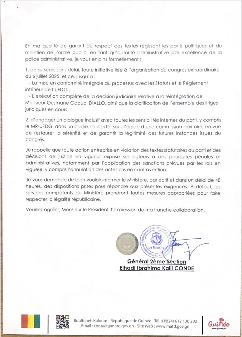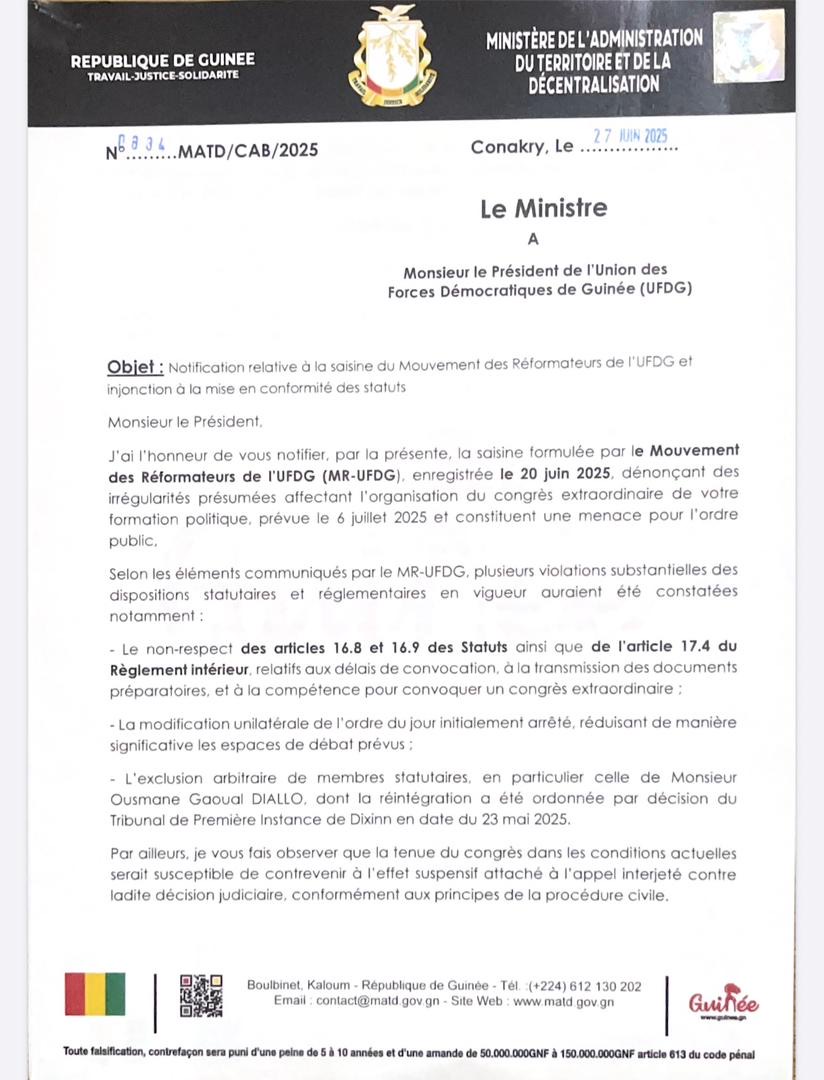 Le Ministère de l’Administration du territoire et de la Décentralisation (MATD), invite le parti vert et blanc à surseoir, sans délai, toute initiative liée à l’organisation du congrès extraordinaire du 6 juillet 2025. Cette décision fait suite à une saisine selon le MATD, du « Mouvement des Réformateurs de l’UFDG » que dirige Ousmane Gaoual Diallo.