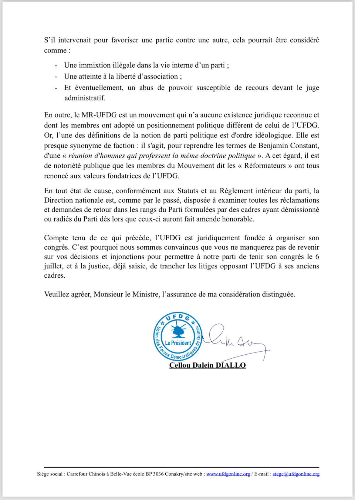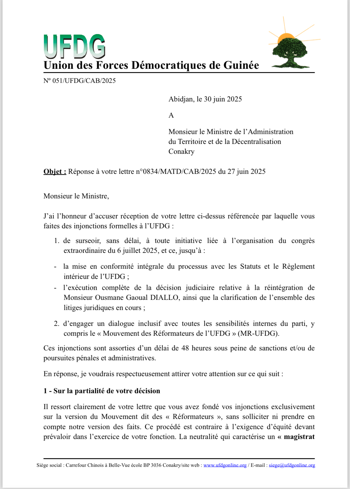 Contraint de suspendre l’organisation de son congrès du 06 juillet, l’Union des forces démocratiques de Guinée (UFDG), par la voix de son président, présentement en Côte d’Ivoire, a adressé un courrier réponse au Ministre de l’administration du territoire et de la décentralisation (MATD).