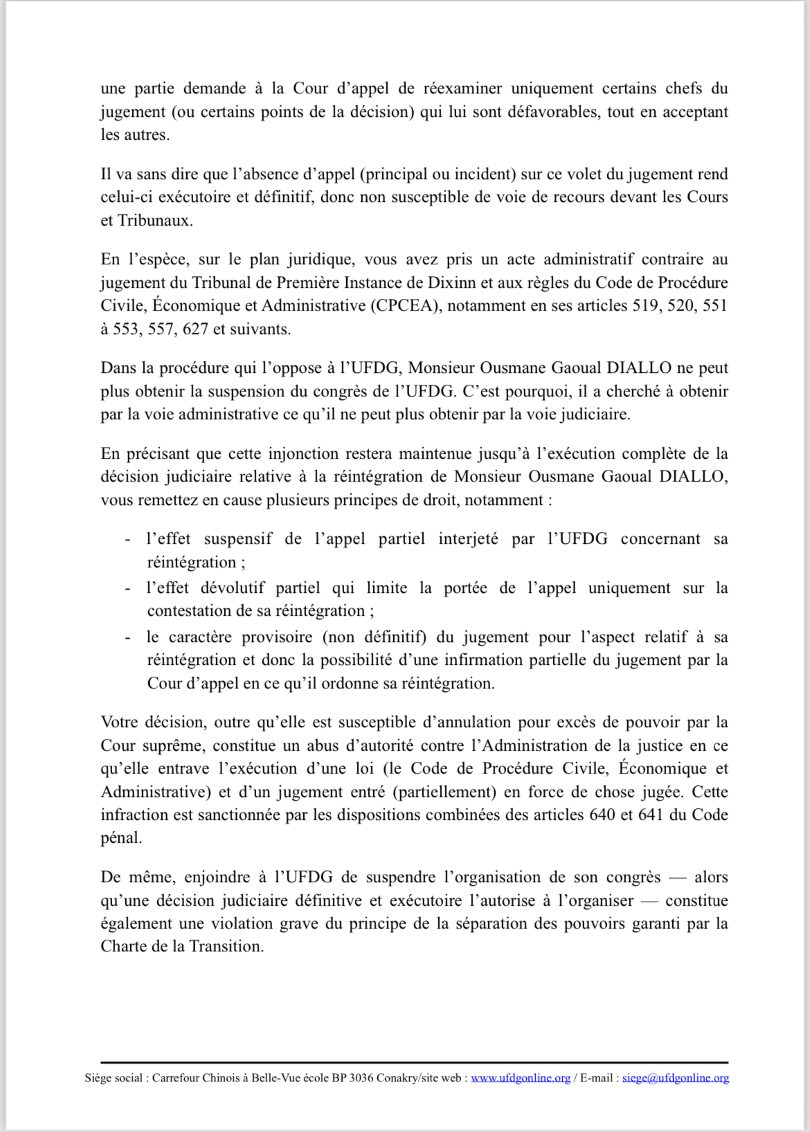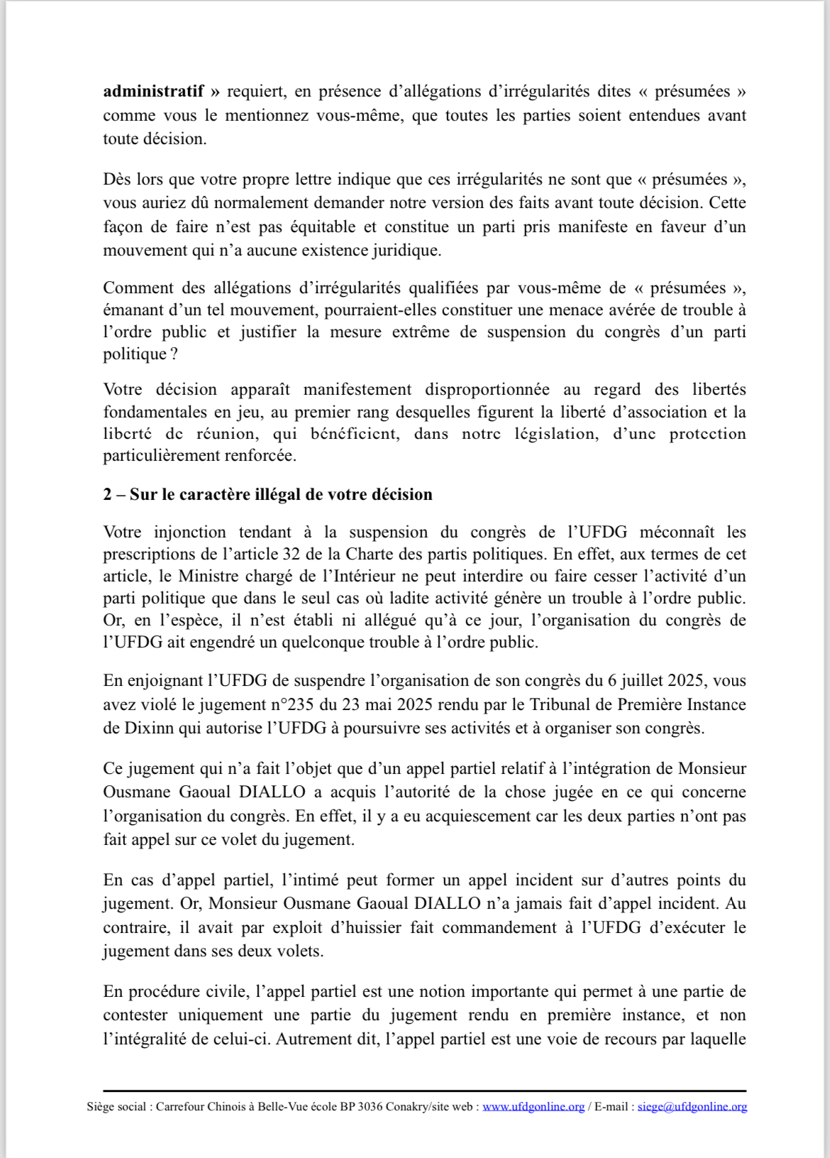 Dans ce document de 5 pages, Cellou Dalein Diallo, reproche au chef du département de l’administration du territoire et de la décentralisation d’avoir violer le principe de neutralité, donc d’avoir soutenu le camp du Mouvement des réformateurs (MR-UFDG), qui n’a « aucun fondement juridique » selon le parti.