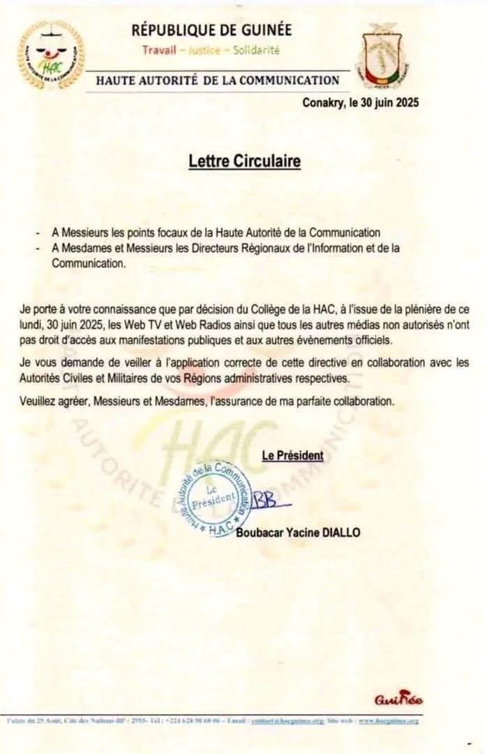 C’est une autre pilule difficile à avaler que la Haute Autorité de la Communication vient d’administrer aux web TV, web radio et autres médias non autorisés à exercer sur le sol guinéen.  L’institution dirigée par Boubacar Yacine Diallo, instruit aux responsables régionaux de l’information et de la communication ainsi que les points focaux de la HAC de veiller à l’application strict de cette décision.