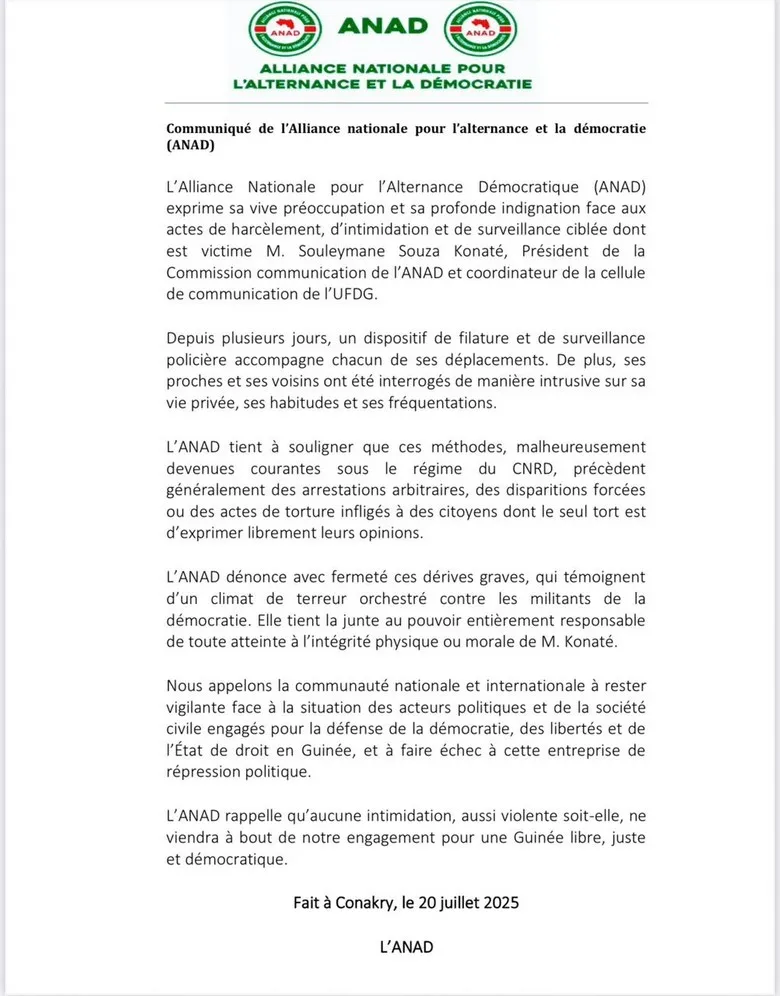Dans un communiqué transmis distillé dans la presse, dimanche 20 juillet 2025, l’ANAD dénonce avec indignation le harcèlement, la surveillance et les intimidations subies par M. Souleymane Souza Konaté, responsable de la communication de l’ANAD et de l’UFDG.