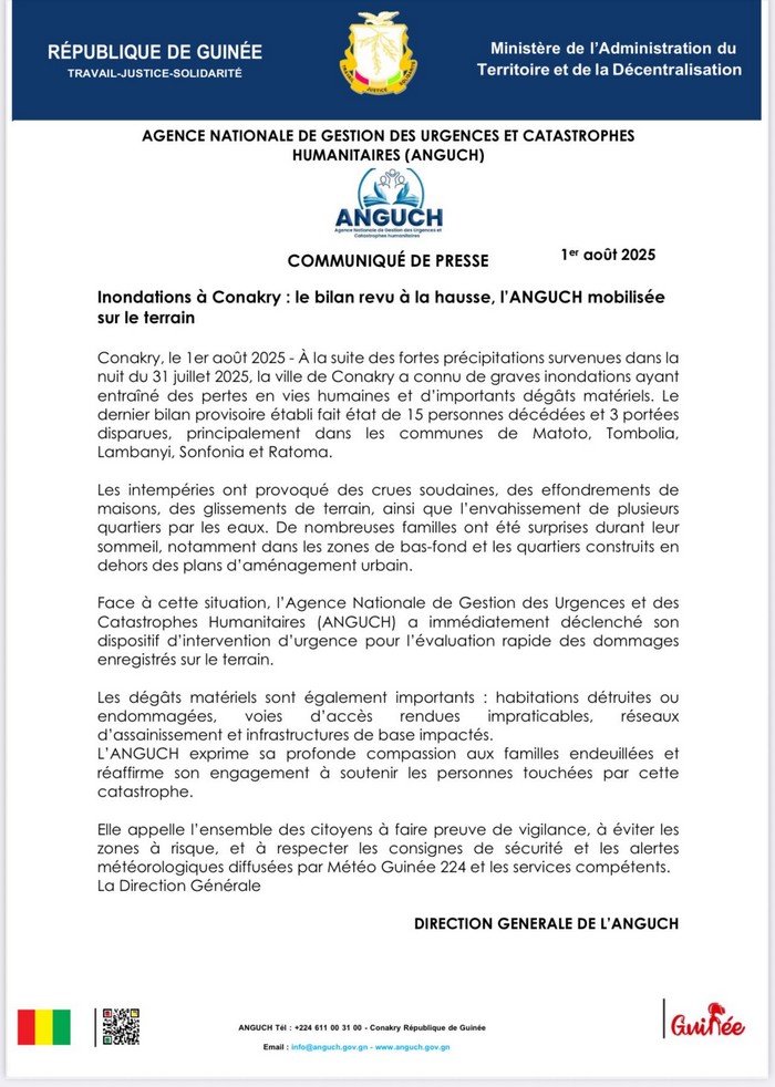 Le bilan des inondations récentes à Conakry a été revu à la hausse. Selon l’ANGUCH, les fortes précipitations de la nuit du 31 juillet 2025 ont causé la mort de 15 personnes et entraîné la disparition de 3 autres, notamment dans les communes de Matoto, Tombolia, Lambanyi, Sonfonia et Ratoma.
