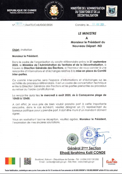 Cette rencontre qui va se ternir sur initiative du Ministère de l’administration du territoire et de la décentralisation (MATD) s’inscrit dans le cadre de la mise en place du processus de dialogue avec les partis politiques en vue du processus référendaire du 21 septembre 2025.