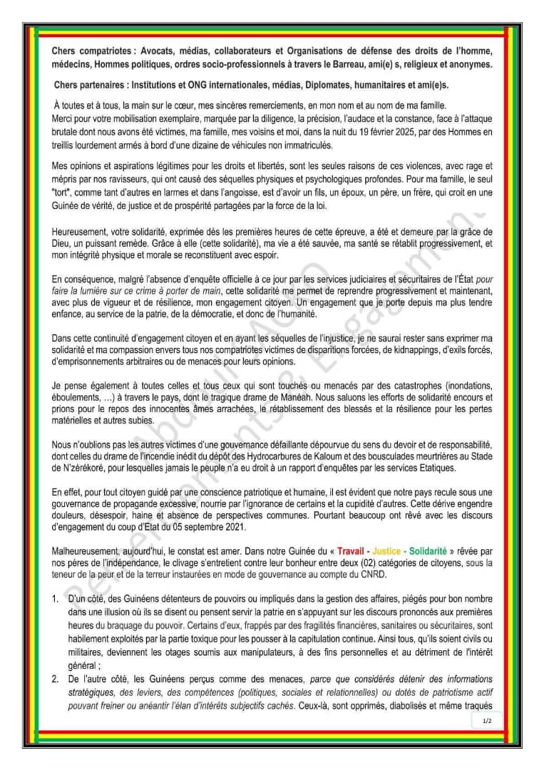 Il exprime sa gratitude envers la chaîne de solidarité qui s’est mobilisée suite à son enlèvement, tout en dénonçant un climat d’intimidation généralisée. Il accuse la junte au pouvoir d’entretenir la répression et la division dans le pays.