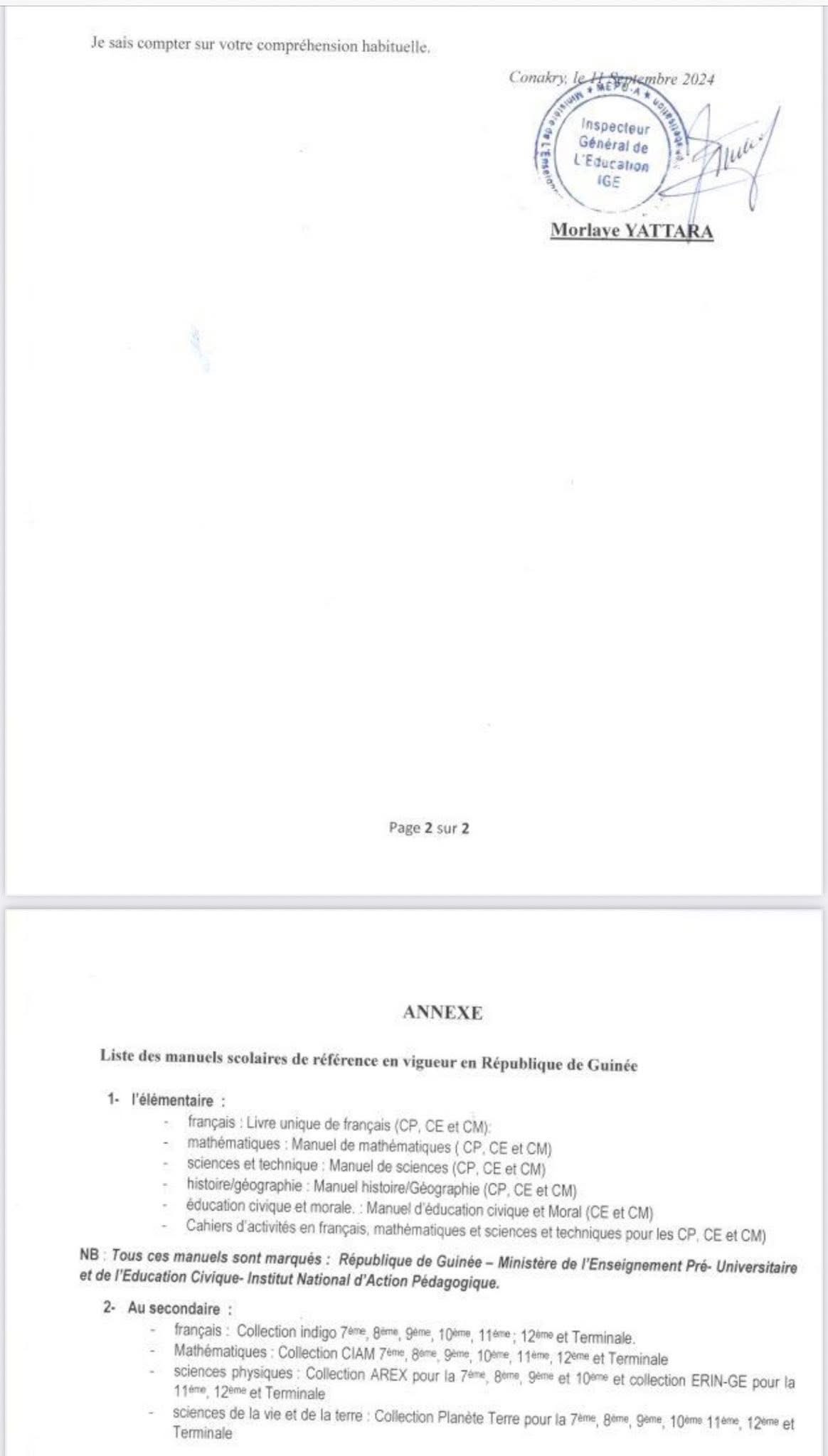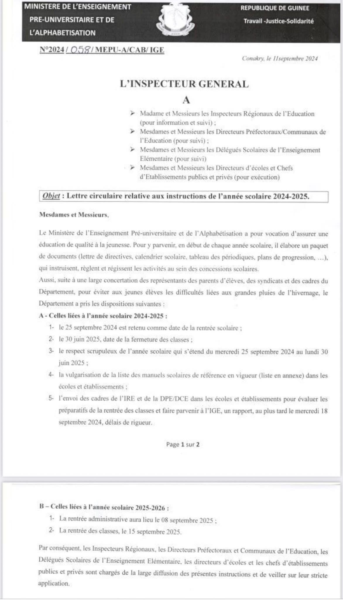 D’après ce document datant de l’année dernière, le 11 septembre 2024 précisément, l’inspecteur général de l’éducation, Morlaye Yattara, avait annoncé que la rentrée scolaire était fixée au 15 septembre. D’où, mentionne le MEPU-A, sur sa page Facebook, la note circulaire en date du 25 août 2025 n’est qu’un « rappel à l’attention des acteurs du système éducatif, des élèves et de leurs parents. »
