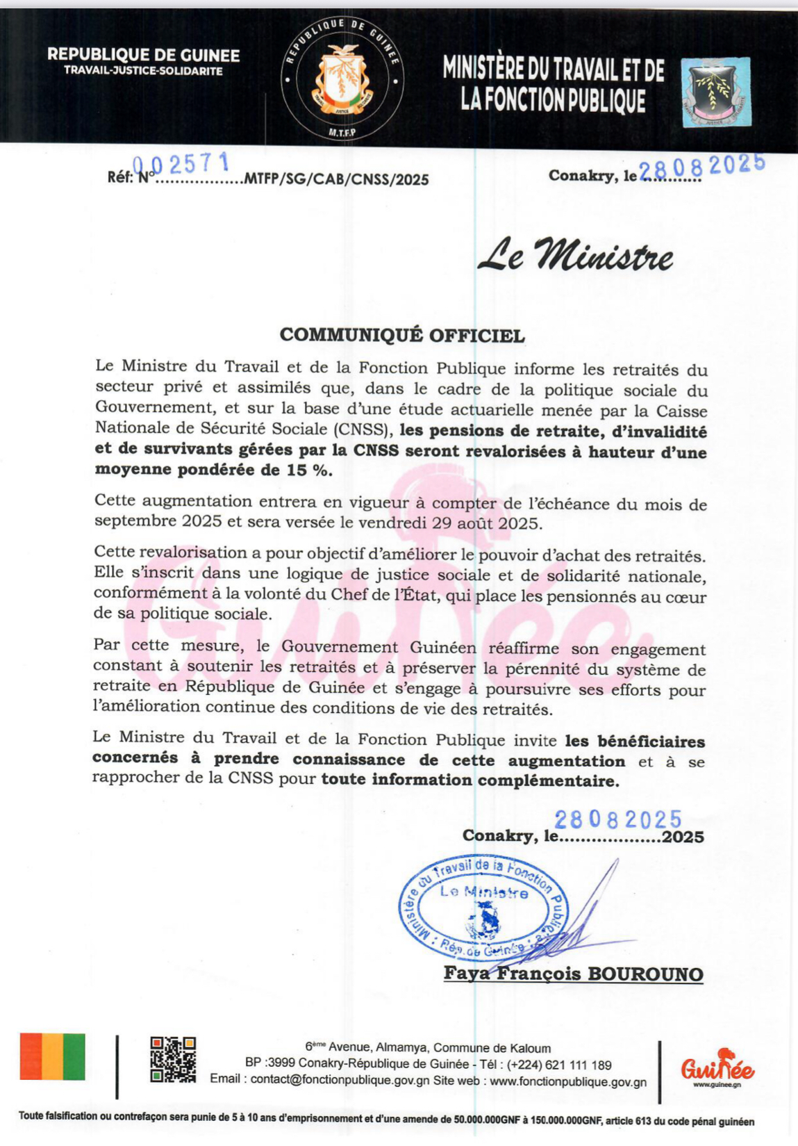 Cette hausse, indique le Ministère du Travail et de la Fonction Publique qui est la tutelle de la Caisse nationale de Sécurité Sociale (CNSS), s’inscrit dans le cadre de la politique sociale du gouvernement afin d’améliorer le pouvoir d’achat des retraités et à renforcer la justice sociale.