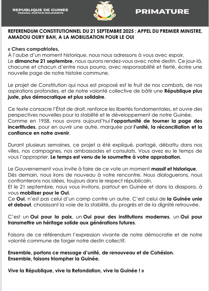 Dans la ferveur de la campagne électorale du référendum constitutionnel du 21 septembre 2025, le Premier ministre, Chef du gouvernement de la transition, Amadou Oury Bah, a fait une déclaration au sein de laquelle il invite les citoyens guinéens à voter massivement pour le « OUI ».