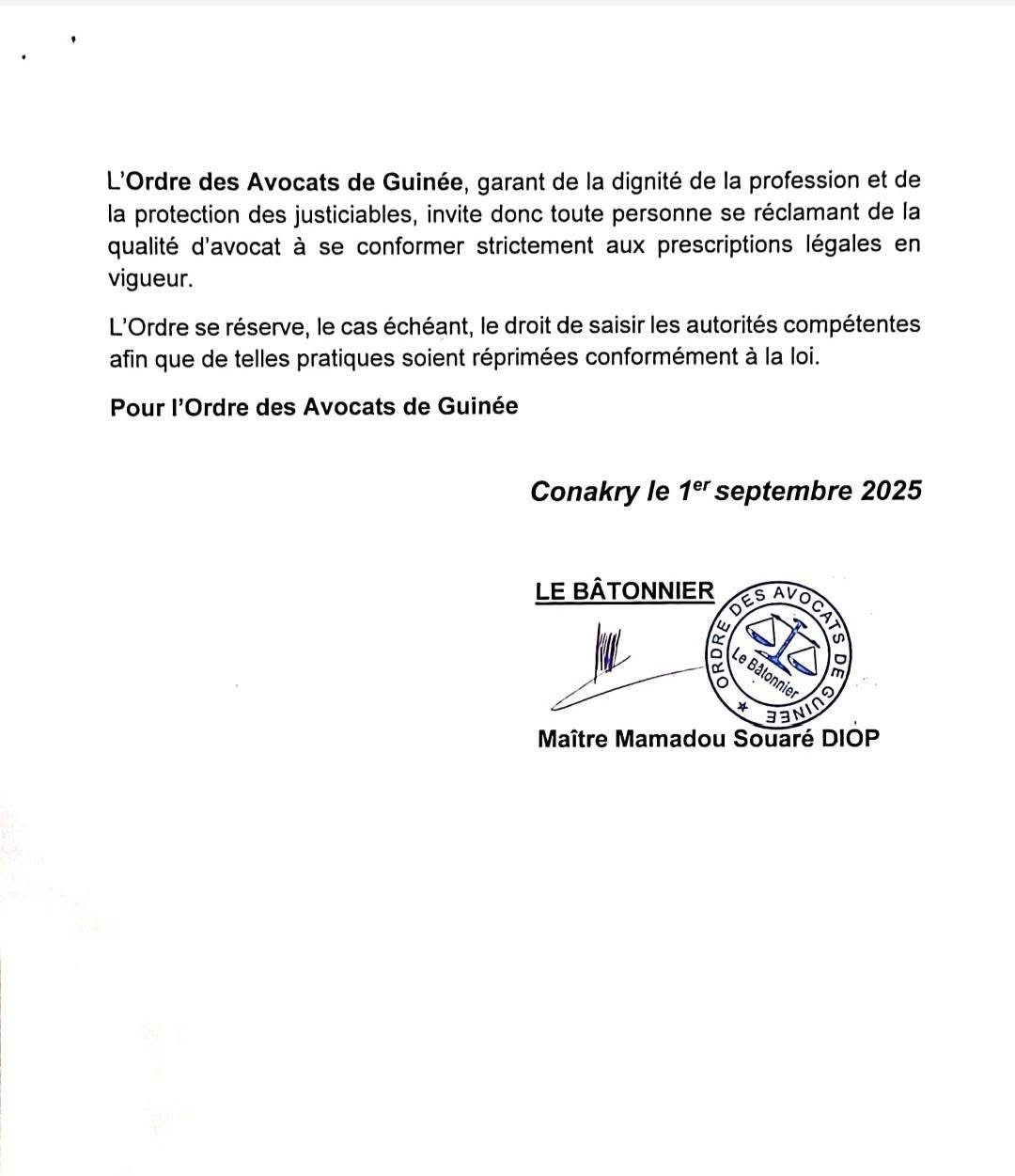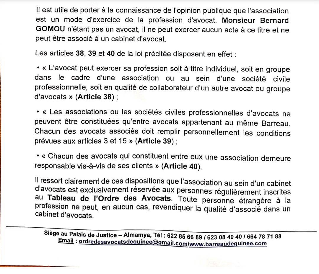 C’est à travers un communiqué en date du 1er septembre 2025, que l’Ordre des avocats de Guinée a brisé le silence face à la sortie de l’ancien Premier ministre, Dr. Bernard Gomou qui a déclaré être affilié à un cabinet d’avocat.