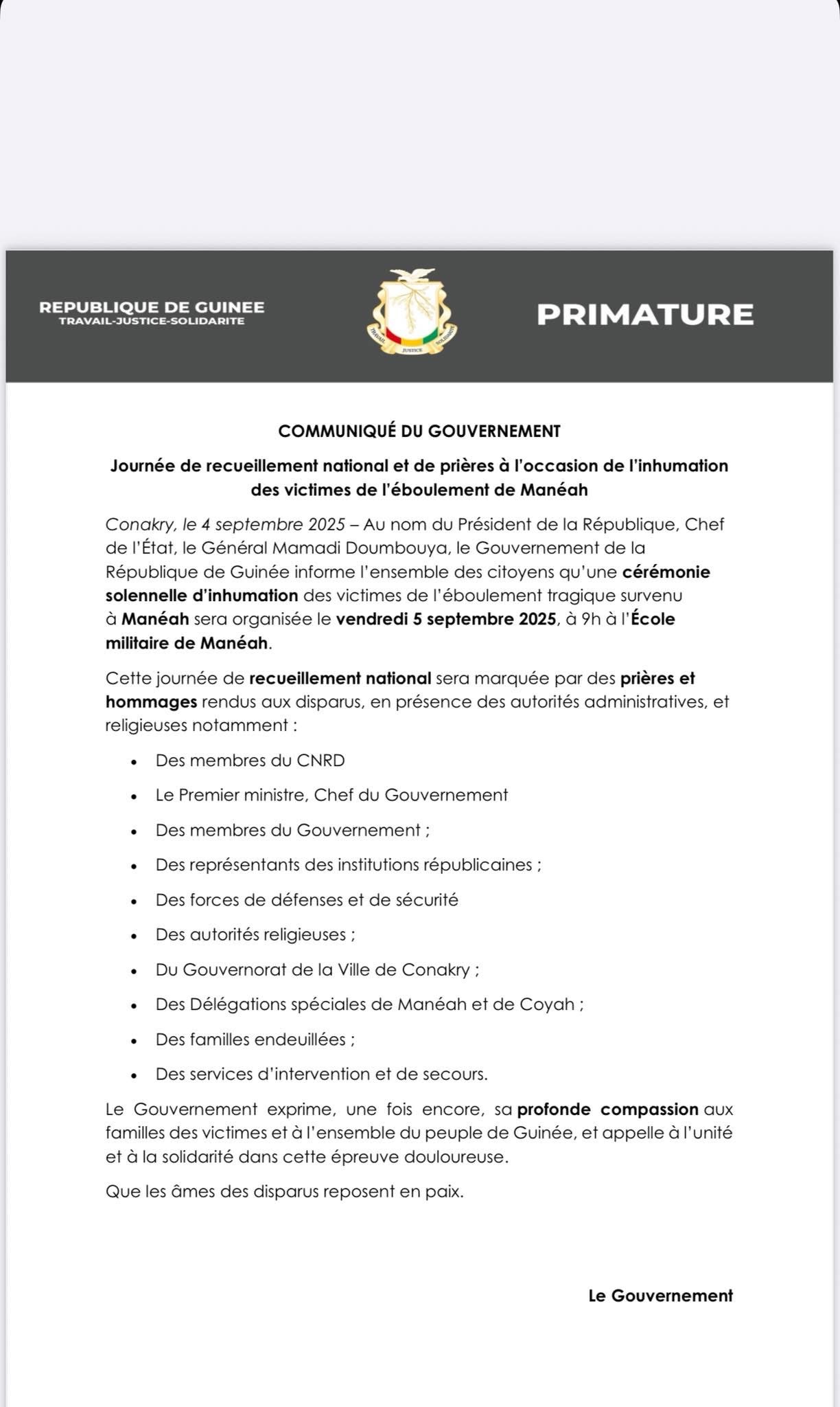 Le gouvernement guinéen a annoncé dans un communiqué diffusé jeudi soir, qu’une cérémonie de recueillement national et de prières à l’occasion de l’inhumation des victimes du drame de Manéah est prévue le vendredi 05 septembre 2025.