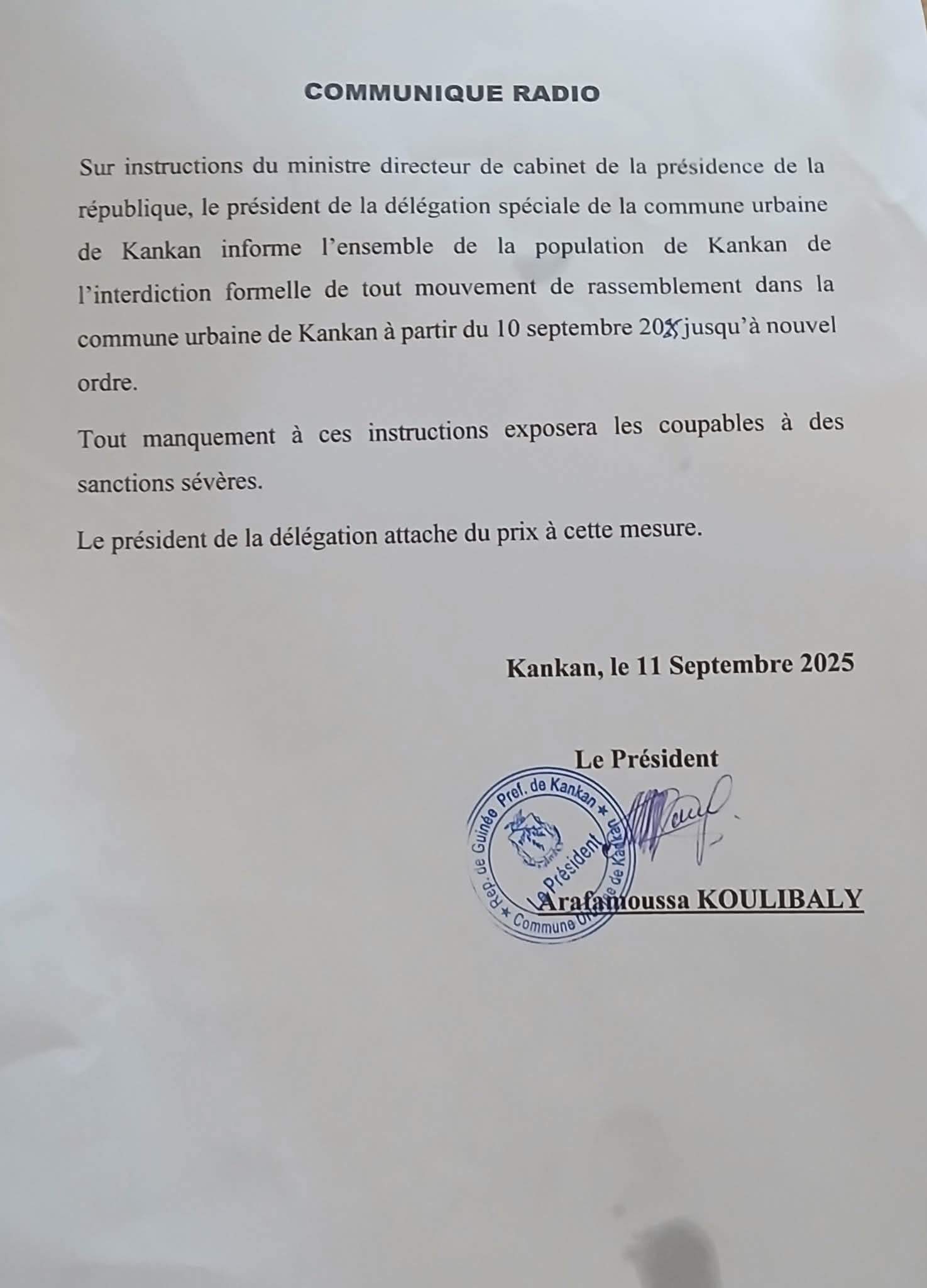 Selon un communiqué radio consulté par enquete224.com, Arafamoussa Koulibaly, président de la délégation spéciale de Kankan, a annoncé qu’ en instruction du ministre directeur de cabinet de la Présidence, M. Djiba Diakité, « tout rassemblement dans la commune urbaine est interdit à partir du 10 septembre jusqu’à nouvel ordre ».