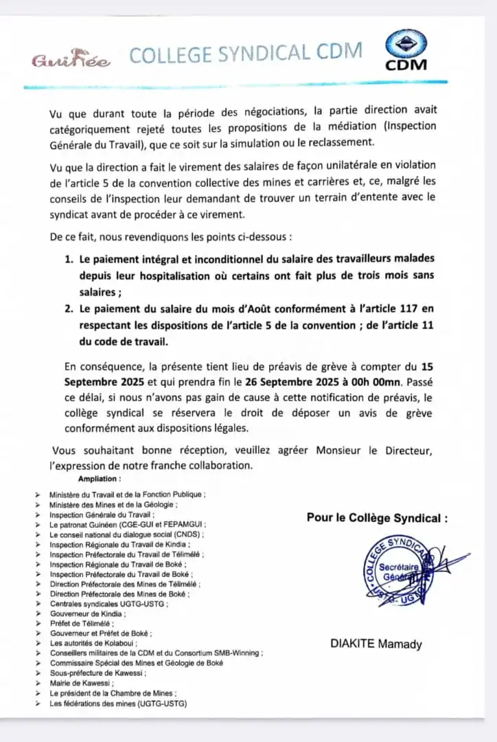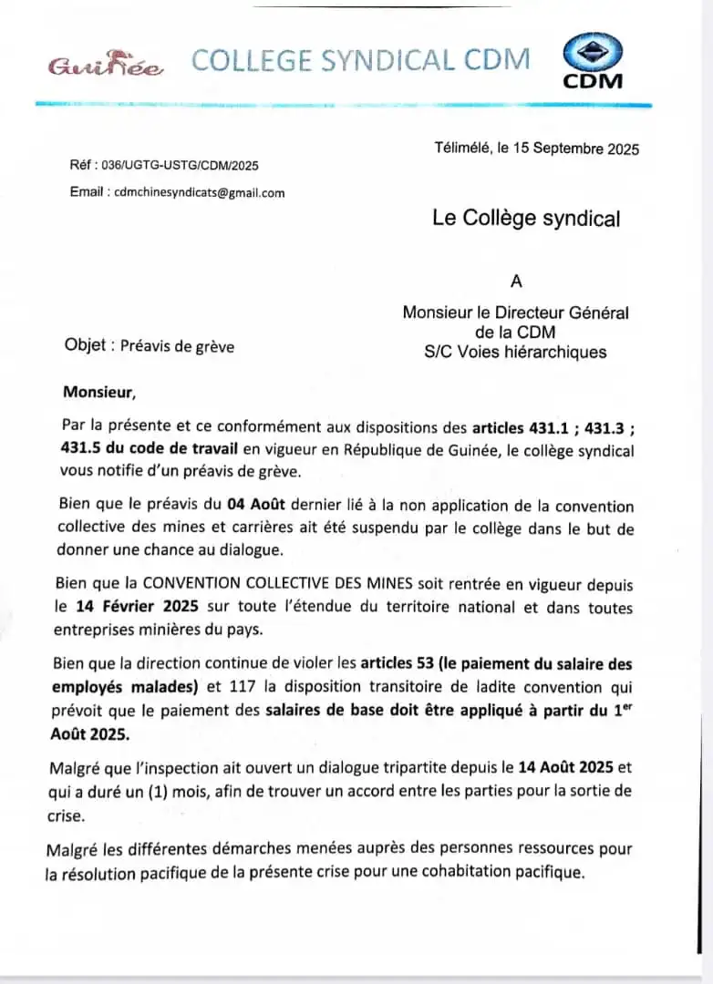Accusant la Direction générale de sa société de violation de certaines dispositions portant sur la convention collective des mines, le collège syndical de ladite société minière a déposé auprès de sa hiérarchie un préavis de grève qu’elle entend déclencher dans 10 jours si ses points de revendications ne sont pas prises en compte.