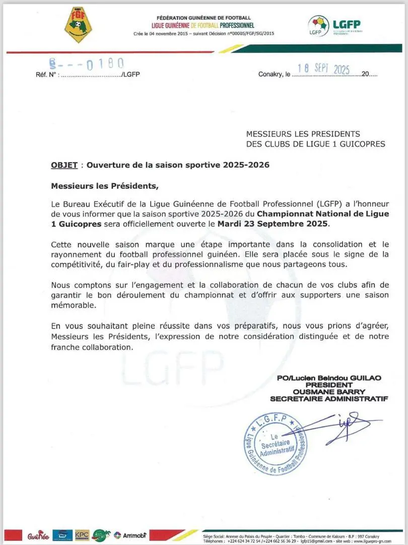 Le Bureau exécutif de l’instance organisatrice des championnats nationaux de football en Guinée, a officialisé la date d’ouverture de la nouvelle saison sportive 2025-2026. La LGFP informe que la date du mardi 23 septembre est retenue pour le coup d’envoi de cette nouvelle saison.
