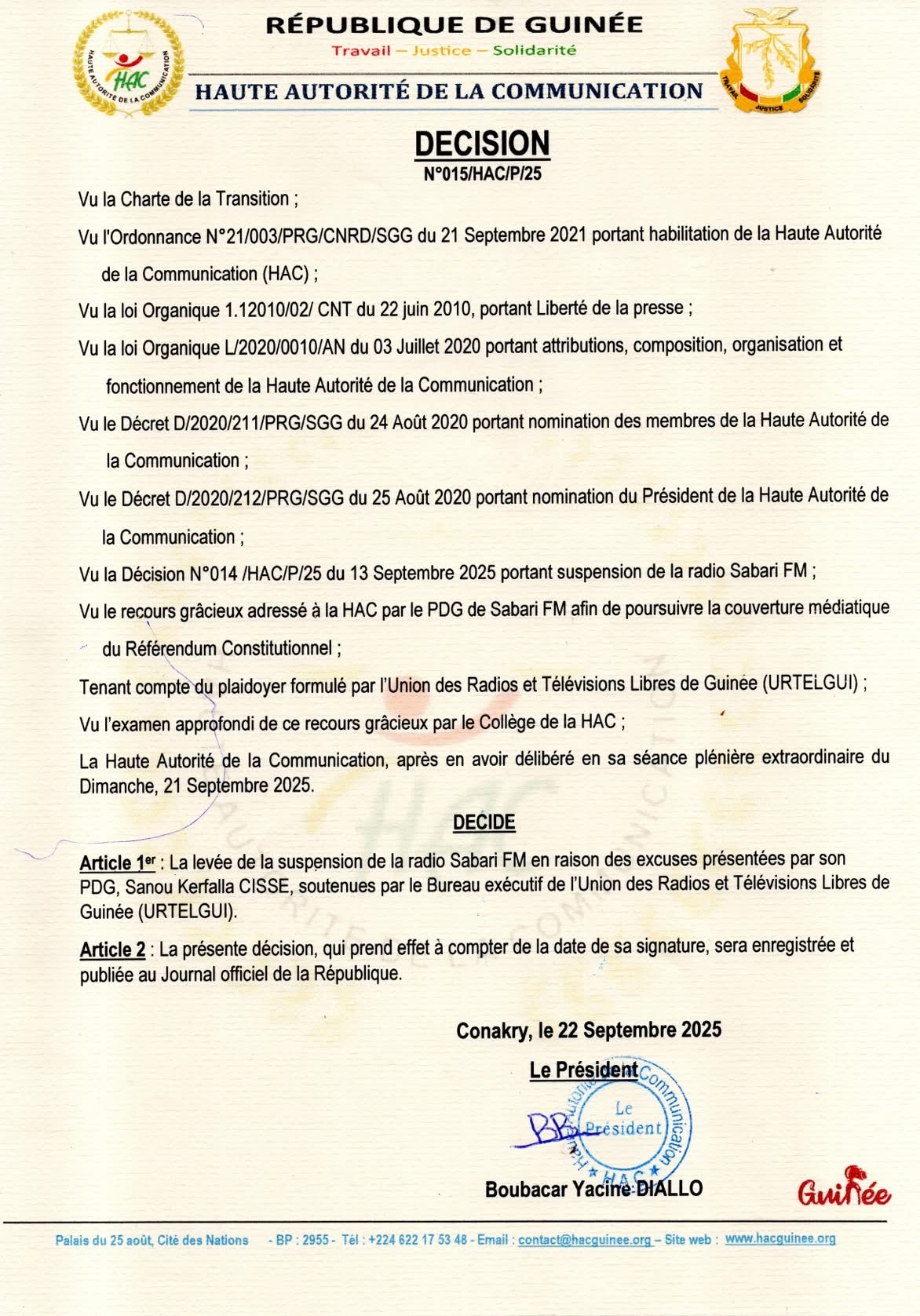Une semaine environ après avoir suspendu la radio Sabary FM et sa Web TV, la Haute autorité de la communication (HAC), est finalement revenue sur sa décision. L’instance de régulation dirigée par Boubacar Yacine Diallo, a indiqué dans une nouvelle décision rendue publique ce lundi 22 septembre, la levée de la suspension du média de Sanou Kerfala Cissé après une demande d’excuses de ce dernier.
