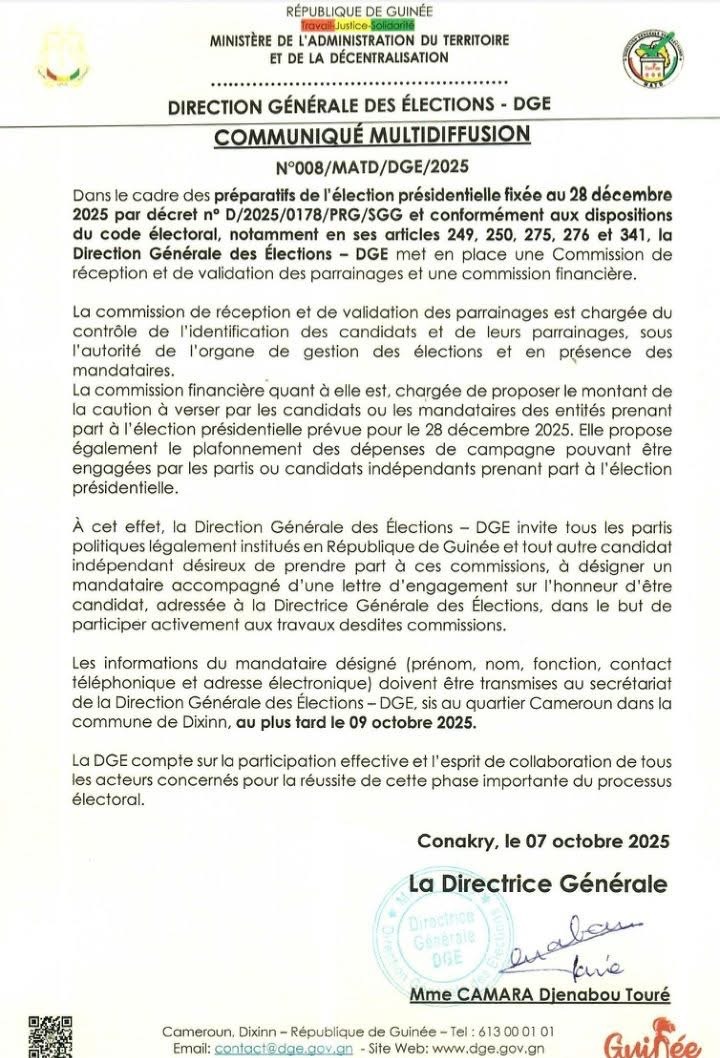 Presidentielle du 28 décembre : la DGE met en place une commission de réception et de validation des parrainages et une commission financière