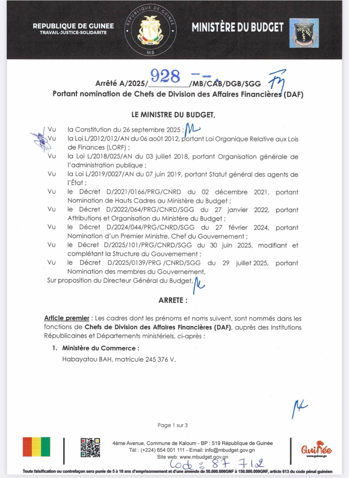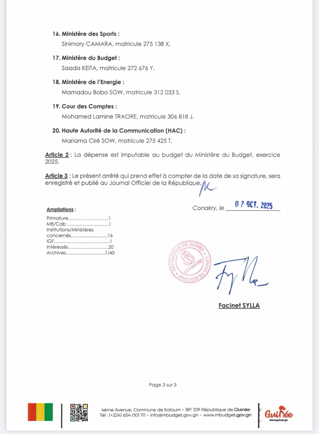Le ministre du Budget, Faciné Sylla, a procédé à la nomination de plusieurs Chefs de Division des affaires financières (DAF).