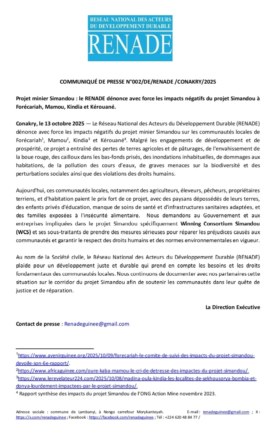 Le Réseau national des acteurs du développement durable (RENADE) a exprimé ses préoccupations concernant les effets délétères du projet minier Simandou, qui affectent les communautés locales situées dans les préfectures de Forécariah, Mamou, Kindia et Kérouané.