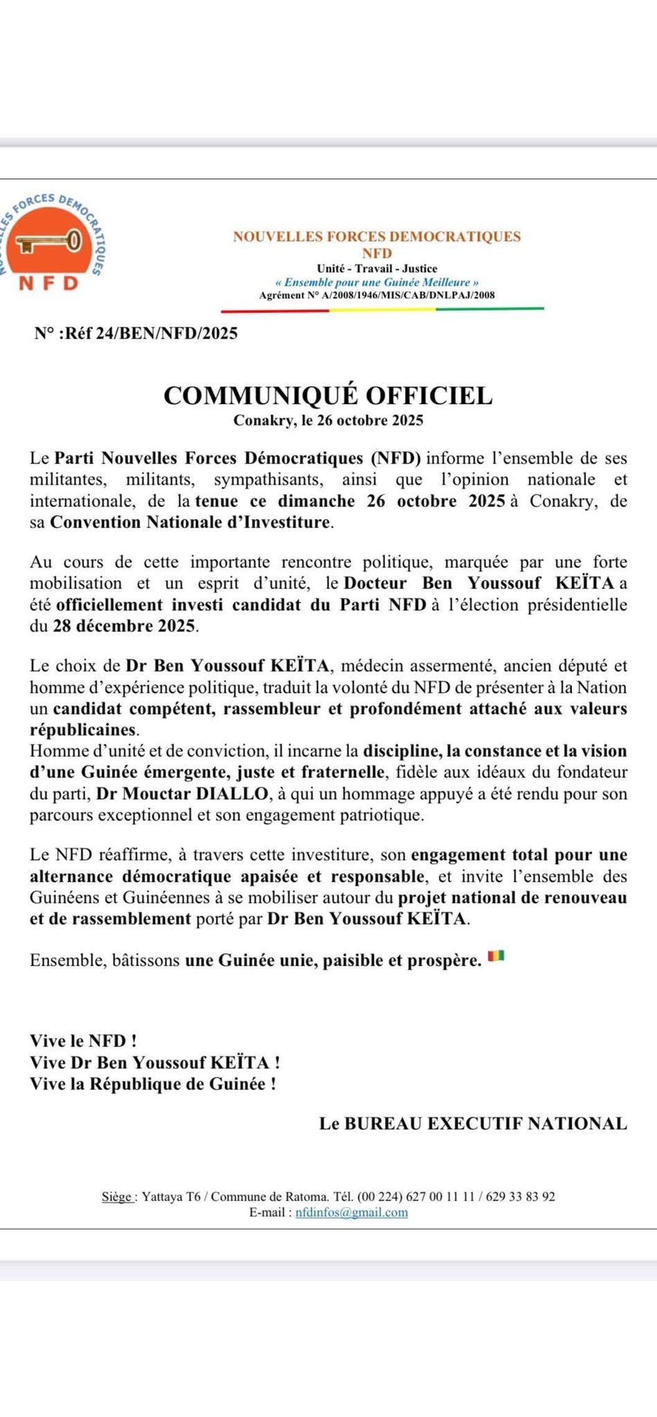 À environ deux mois de l’élection présidentielle prévue pour le 28 décembre 2025, le parti NFD a officiellement désigné l’ancien député de l’UFDG, Dr Ben Youssouf Keïta, comme candidat pour représenter le parti lors de ce scrutin.