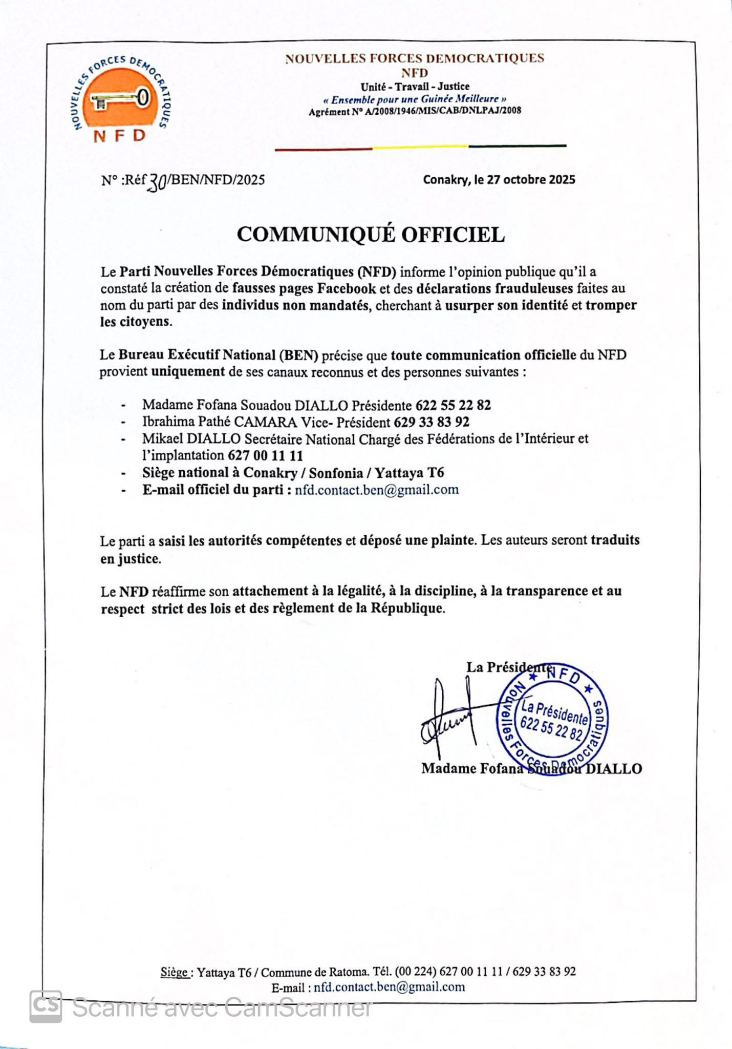 Dans un communiqué en date du 27 octobre 2025, brise le silence face à ce qu’il qualifie d’usurpation d’identité par des “individus non mandatés” qui cherchent à salir son image. Face à cette situation, le parti annonce avoir saisi la justice contre ses usurpateurs.
