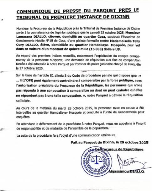 Dans un communiqué de presse daté du 29 octobre 2025, le procureur Algassimou Diallo a révélé que la jeune femme mise en cause dans cette affaire est accusée d’avoir volé 15 000 dollars à Lamarana Diallo, qui a saisi l’Escadron de la Gendarmerie Mobile No 18 de Cosa. Voir communiqué ci-dessous :