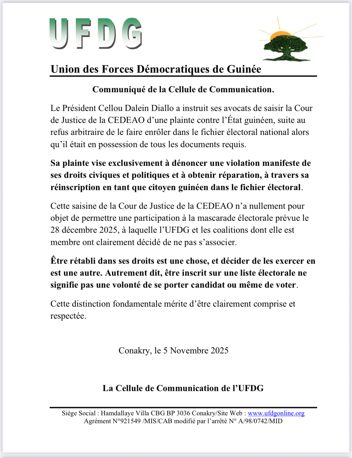 D’après son parti, UFDG, cette décision de Cellou Dalein Diallo de saisir la Cour de justice de la CEDEAO, consiste à dénoncer la volonté des dirigeants guinéens de l’empêcher de jouir de ses droits civiques et politiques.