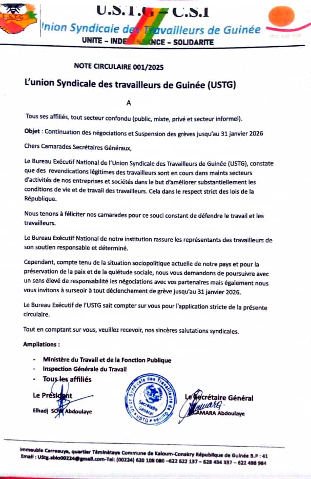 Face aux menaces de grèves qui pèsent sur plusieurs secteurs à l’horizon, l’Union syndicale des travailleurs de Guinée (USTG) invite ses affiliés à poursuivre les négociations et à surseoir à tout déclenchement de grève jusqu’à la fin du mois de janvier de l’année prochaine. Pour justifier cette démarche, l’USTG évoque la situation sociopolitique actuelle du pays, dans le but de préserver la paix et la quiétude sociales.