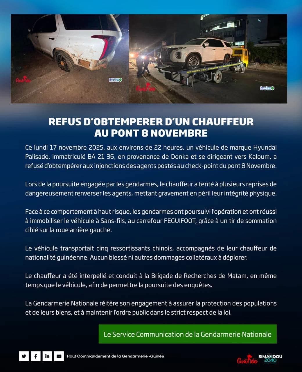 Conakry, le 17 novembre 2025 — Dans la soirée du lundi, vers 22 heures, un véhicule Hyundai Palisade immatriculé BA 21 36, en provenance de Donka et se dirigeant vers Kaloum, a refusé d’obtempérer aux instructions des agents stationnés au check-point du pont 8 Novembre.
