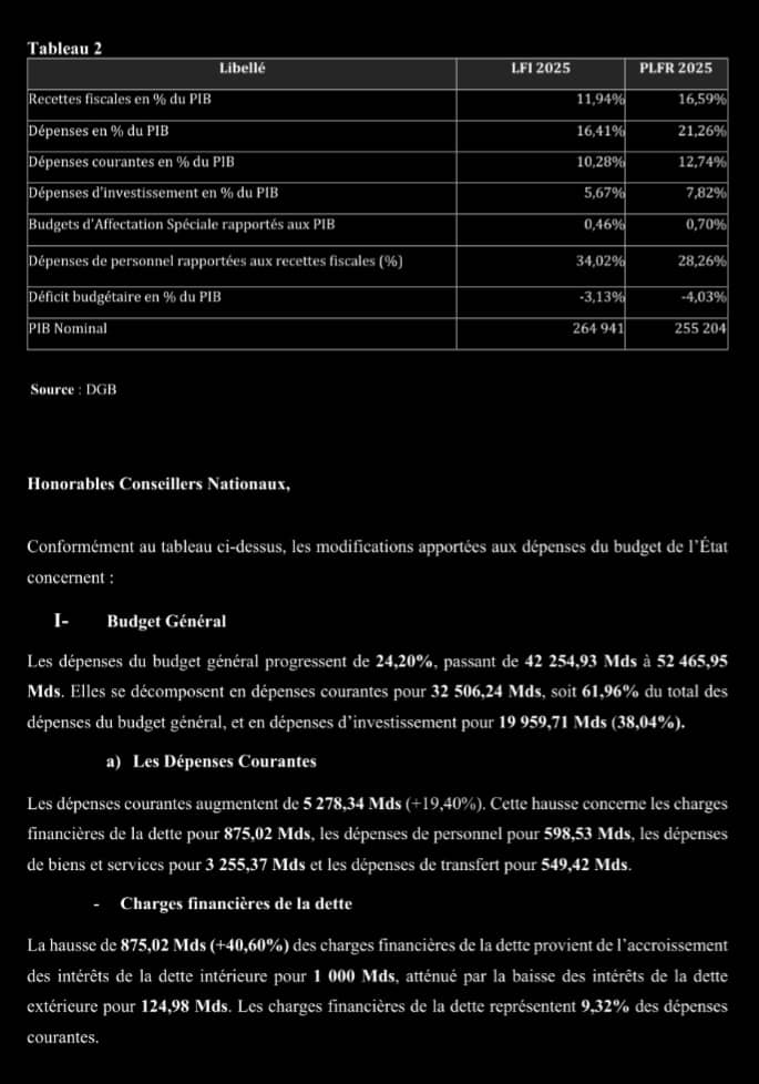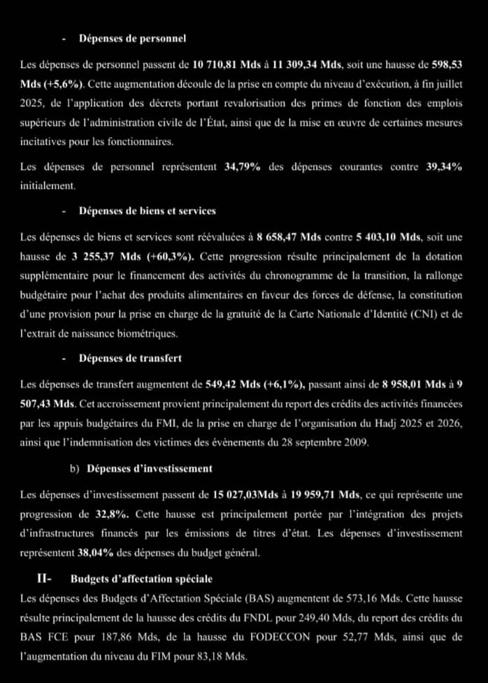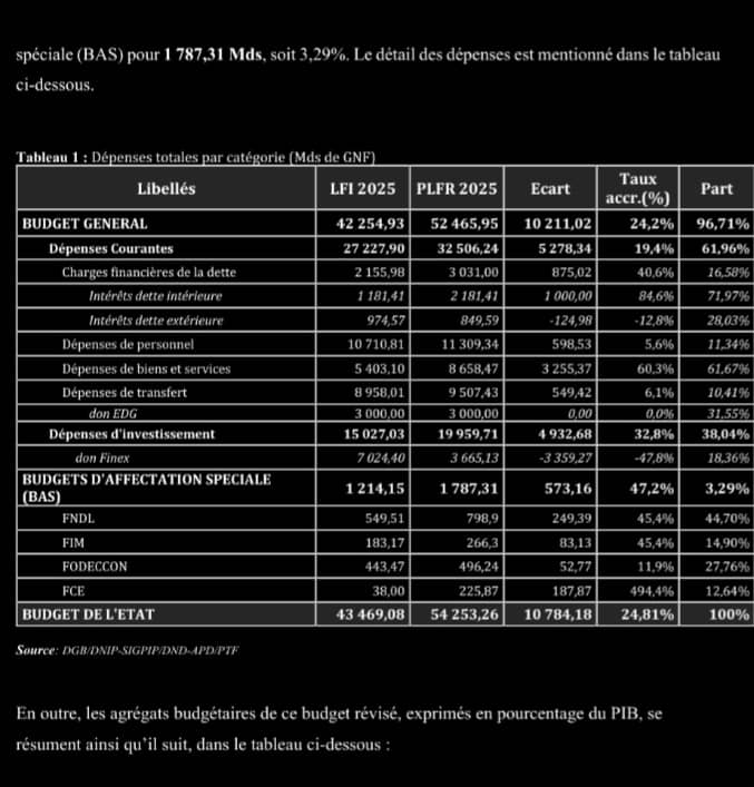 Suite à ces ajustements, la prévision globale des dépenses de l’État pour l’année 2025 s’élève désormais à 54 253,26 milliards de francs guinéens, soit une hausse de 10 784,18 milliards de francs guinéens (+24,81 %) par rapport aux prévisions initiales.