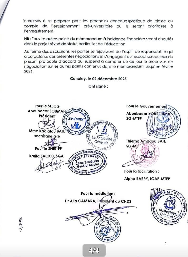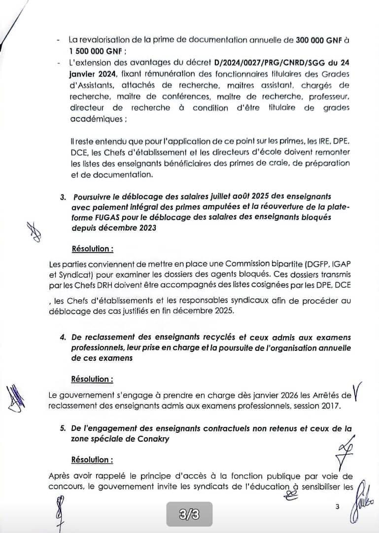 L’accord prévoit aussi la mise en place de primes pour les enseignants du ministère de l’Éducation préuniversitaire et de l’Enseignement technique, issues des discussions autour de la révision du statut particulier de la fonction éducative. Le gouvernement, souligne la secrétaire générale du SLECG, a montré sa volonté de créer un statut commun pour l’enseignement préuniversitaire, technique et supérieur.