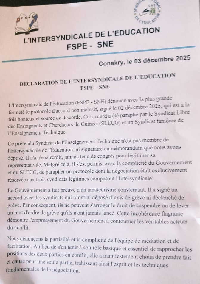 La nouvelle crise qui mine le système éducatif guinéen est visiblement loin de connaître son épilogue. L’Intersyndicale de l’Éducation (FSPE – SNE) dénonce avec la plus grande fermeté le protocole d’accord qu’il qualifie de « non inclusif », signé le 02 décembre 2025, qui est selon le syndicat « à la fois honteux et source de discorde ». Cet accord a été paraphé par le Syndicat Libre des Enseignants et Chercheurs de Guinée (SLECG) et un Syndicat fantôme de l’Enseignement Technique.