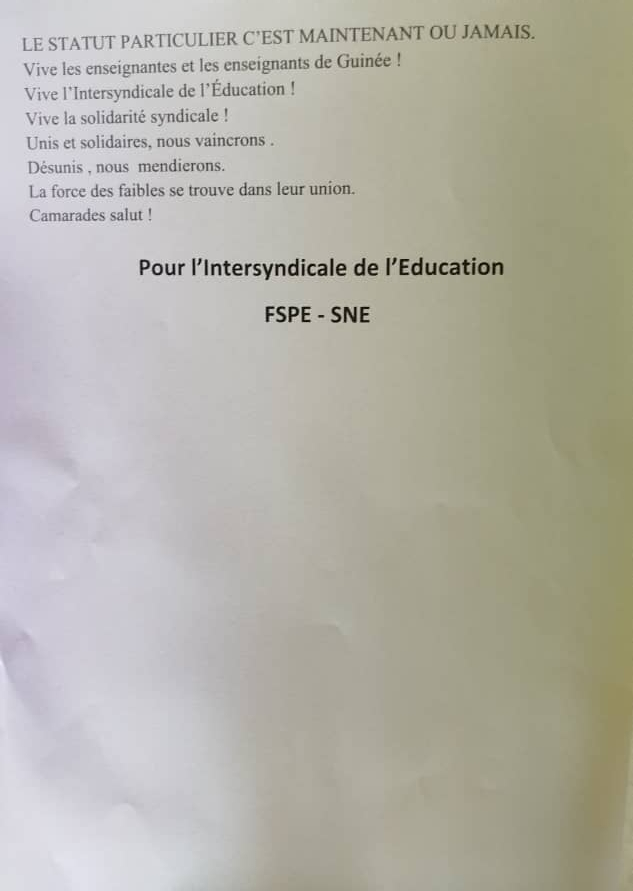 « Ce prétendu Syndicat de l’Enseignement Technique n’est pas membre de I’Intersyndicale de l’Éducation, ni signataire du mémorandum que nous avons déposé. Il n’a, de surcroît, jamais tenu de congrès pour légitimer sa représentativité. Malgré cela, il s’est permis, avec la complicité du Gouvernement et du SLECG, de parapher un protocole dont la négociation était exclusivement réservée aux trois syndicats légitimes composant l’Intersyndicale. Le Gouvernement a fait preuve d’un amateurisme consternant. Il a signé un accord avec des syndicats qui n’ont ni déposé d’avis de grève ni déclenché de grève. Par conséquent, ils ne peuvent s’arroger le droit de suspendre ou de lever un mot d’ordre de grève qu’ils n’ont jamais lancé. »
