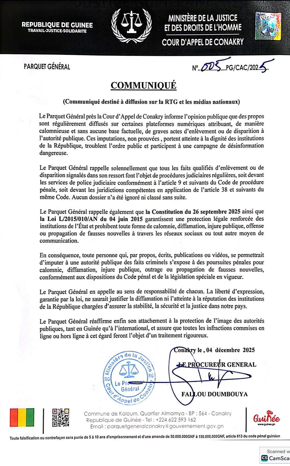 Enquete224.com, vous propose de parcourir le communiqué ci-dessous :