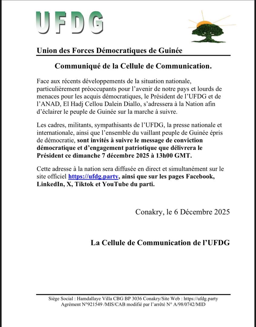 Alors que la Guinée connaît une période politique préoccupante selon de nombreux observateurs, El Hadj Cellou Dalein Diallo, Président de l’UFDG et de l’ANAD, s’adressera solennellement à la nation ce dimanche 7 décembre 2025 à 13h00 GMT.
