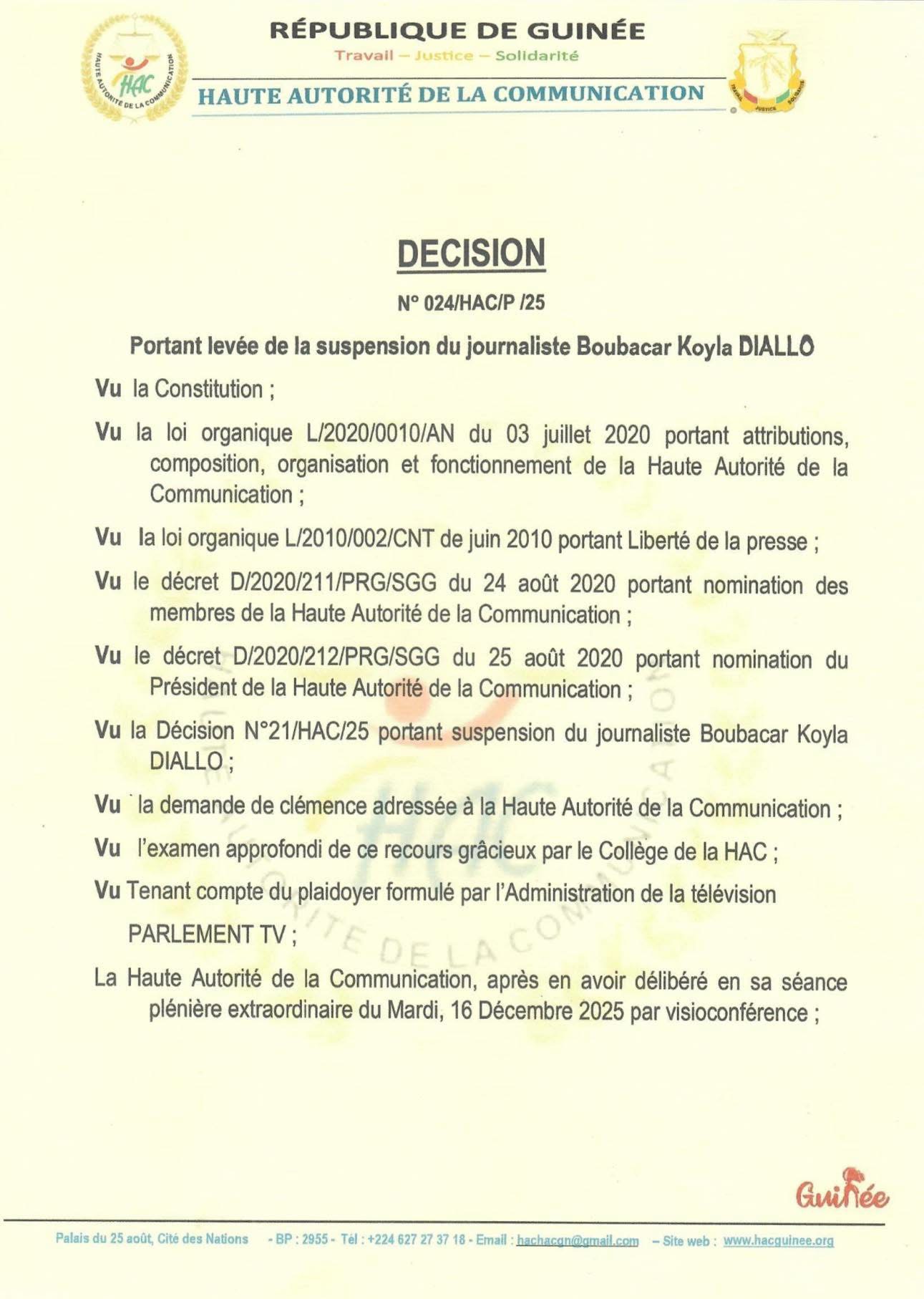 Enquete224.com, vous propose ci-dessous la décision de la HAC :