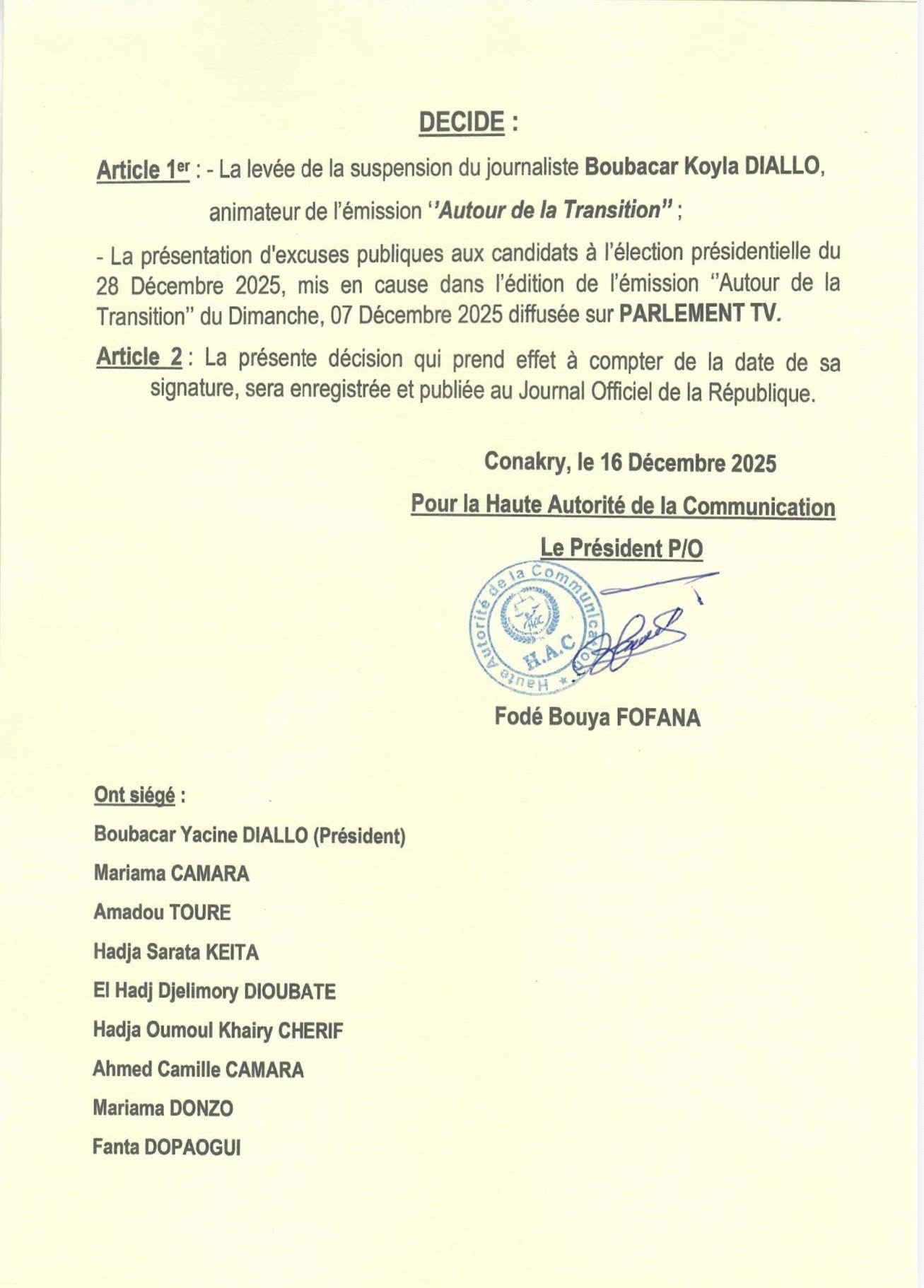 Cette décision de la HAC est prise à l’issue de la présentation d’excuses publiques par Boubacar Koyla Diallo vis-à-vis aux candidats de la présidentielle du 28 décembre mis en cause lors de l’émission du 7 décembre 2025.