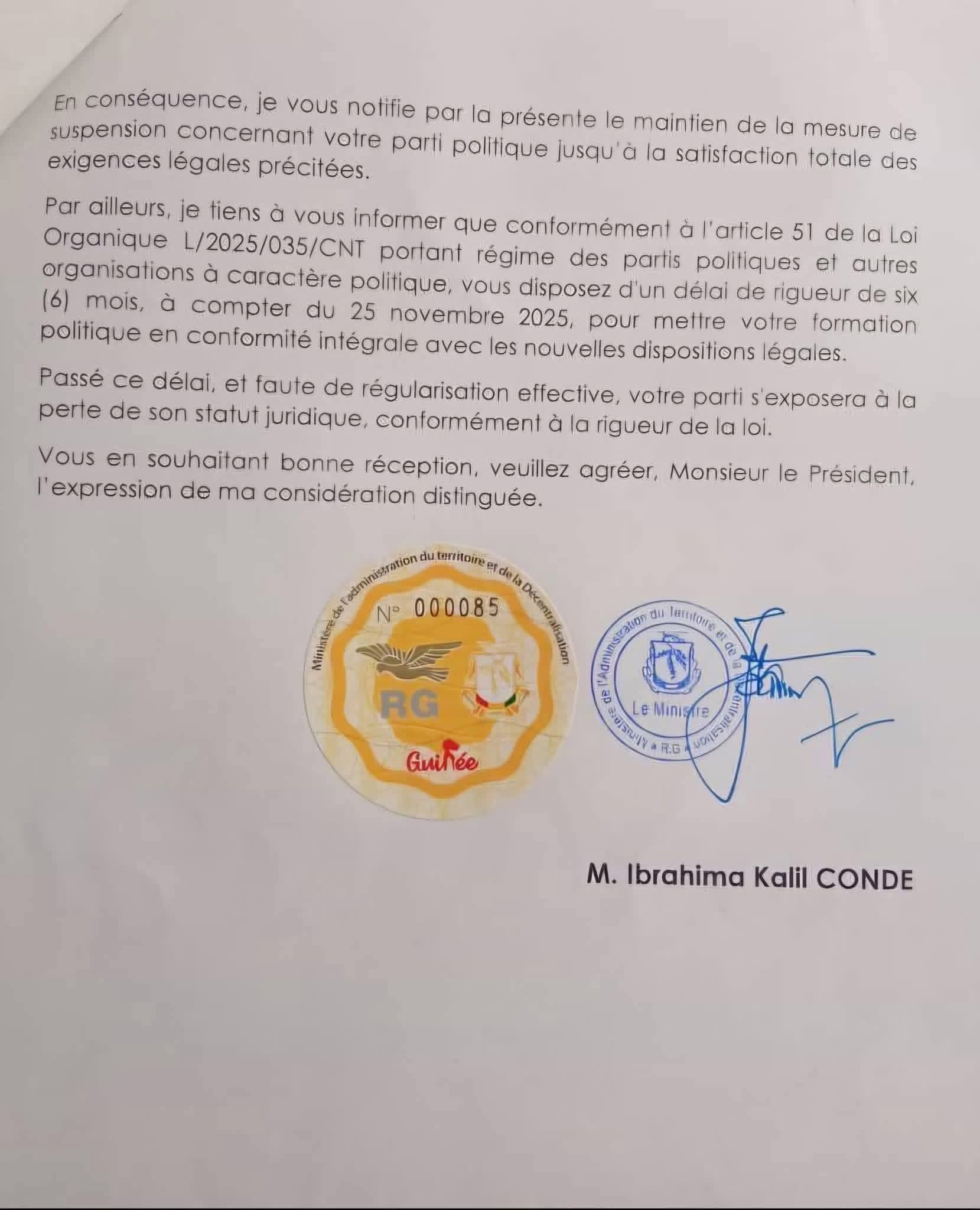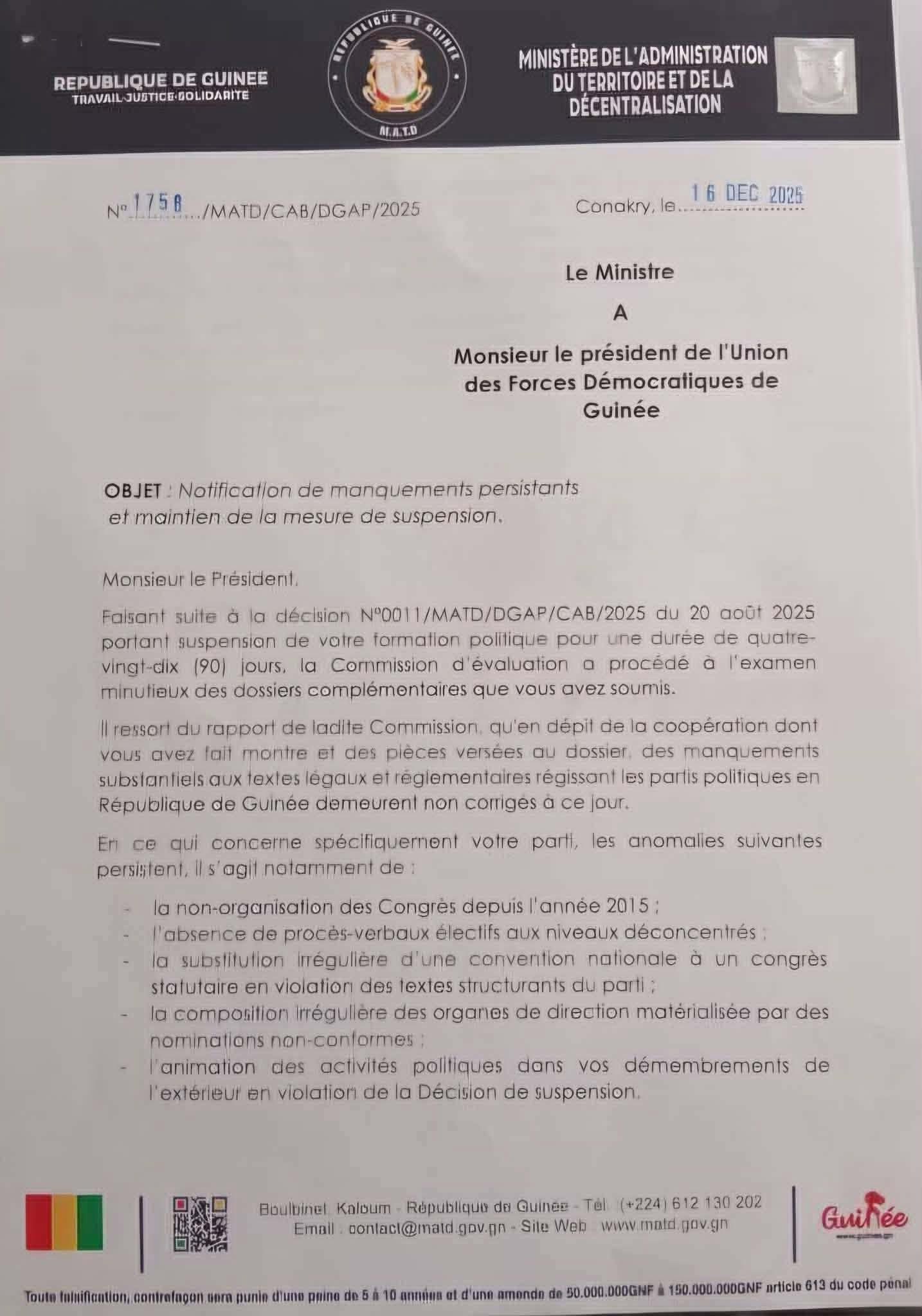 Alors que le parti Union des Forces Démocratiques de Guinée (UFDG) se préparait à reprendre ses activités politiques en Guinée après l’expiration du délai de 90 jours de suspension qui lui avait été imposé, le Ministère de l’Administration du Territoire et de la Décentralisation (MATD) revient à la charge avec une nouvelle interdiction. Cette fois-ci, le MATD informe le président de l’UFDG que sa formation politique est suspendue jusqu’à la satisfaction totale des exigences légales, comme indiqué dans le courrier ci-dessous :