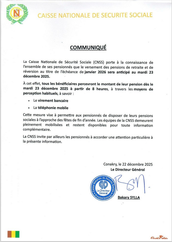 La Caisse Nationale de Sécurité Sociale (CNSS) porte à la connaissance de l’ensemble de ses pensionnés que le versement des pensions de retraite et de réversion au titre de l’échéance de janvier 2026 sera anticipé au mardi 23