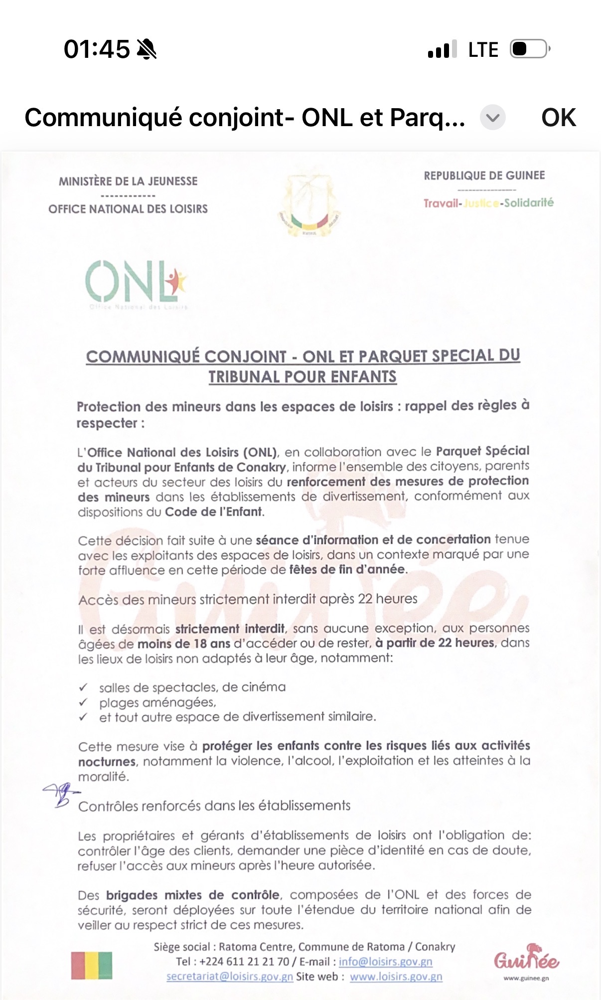 L’ONL rappelle qu’il est désormais formellement interdit, sans aucune exception, aux mineurs d’c’acceder ou de rester à partir de 22h dans les lieux de loisirs non adaptés à leur âge.
